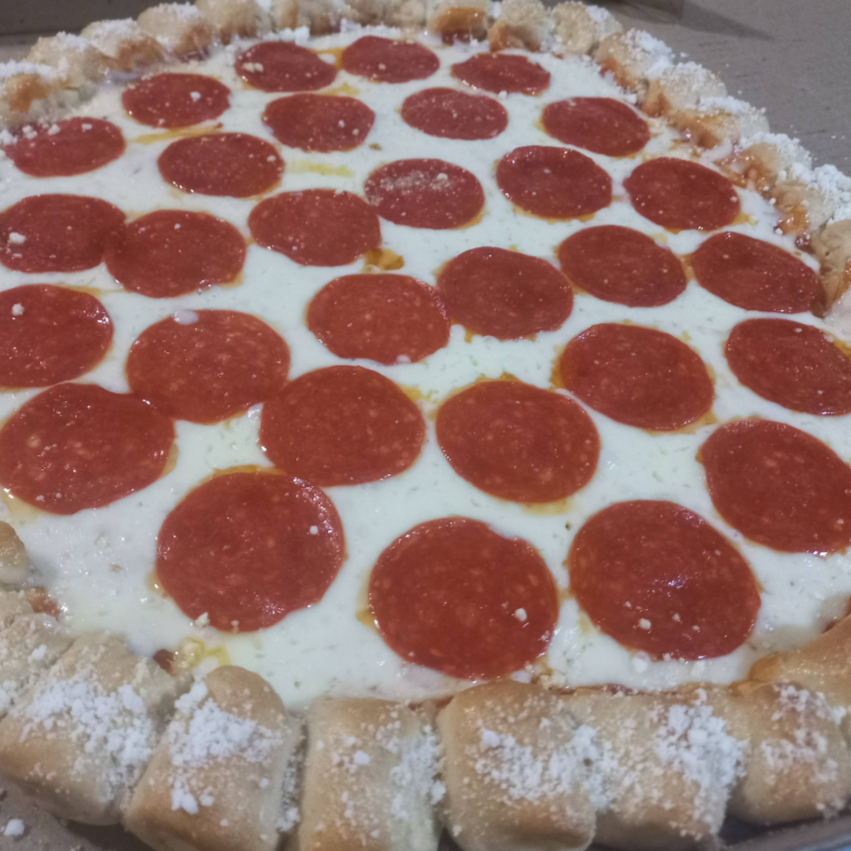 Pizza grande de Queso Mozarella con peperonni y orilla de dedos rellena de queso philadelphia espolvoreados con queso parmesano