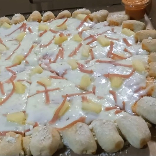 Pizza grande de base de jamón, Queso Mozarella , piña, tiritas de jamón y orilla de dedos rellena de queso philadelphia espolvoreados con queso parmesano