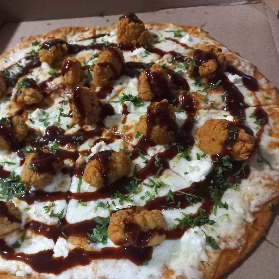 Pizza Grande con una base de queso mozzarella derretido, trozos de philadelphia, cebolla, boneless 100% de pollo bañados en salsa de su preferencia y cilantro
