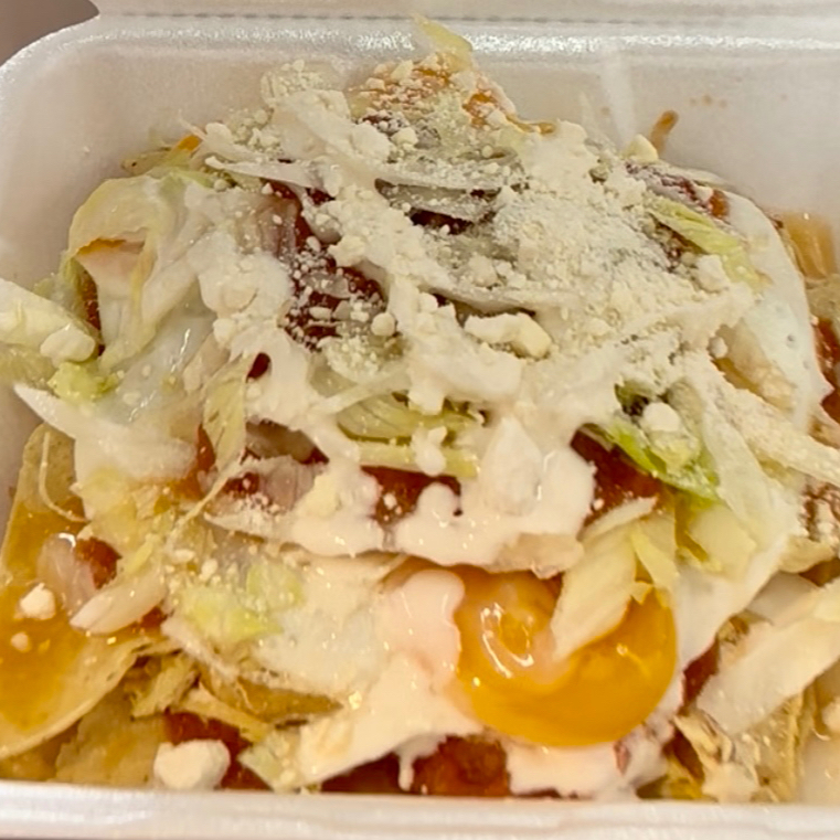 Base de totopos con salsa de tomate, pollo, 2 huevos estrellados, lechuga, media crema y queso sopero
