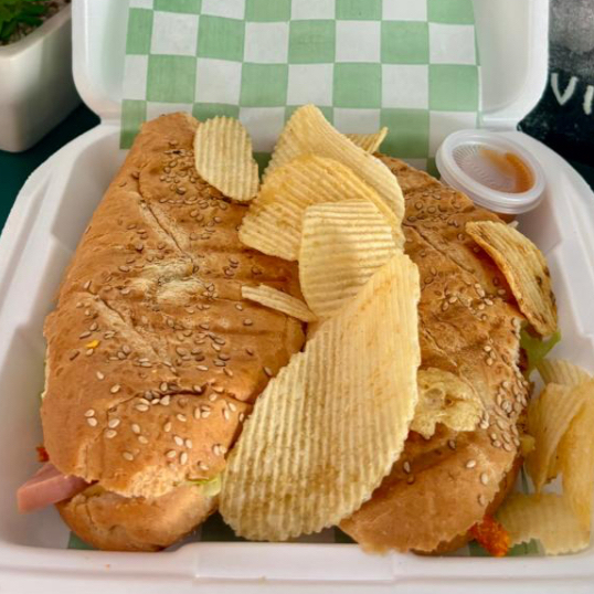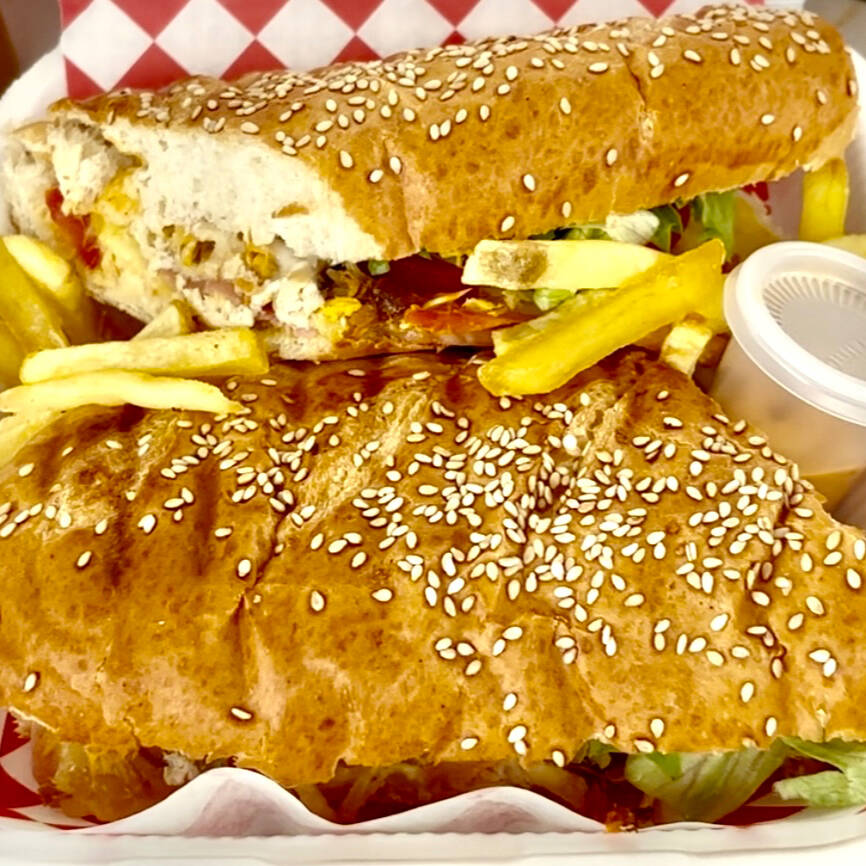 Baguette de 40cm con aderezos, carne asada, pollo, chuleta ahumada, lechuga, tomate y bien tostado