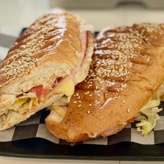 Baguette de 40cm, aderezos, rebanadas de jamón de pavo, queso manchego, lechuga y tomate, tostado
