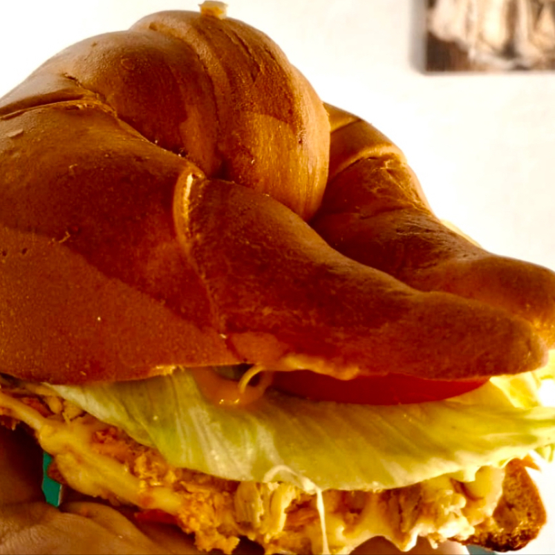 Croissant con aderezos, pollo desmenuzado, lechuga, tomate, queso manchego gratinado