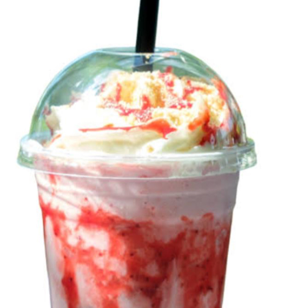 Leche, base de malteada, fresas naturales, sirope de fresa, crema batida