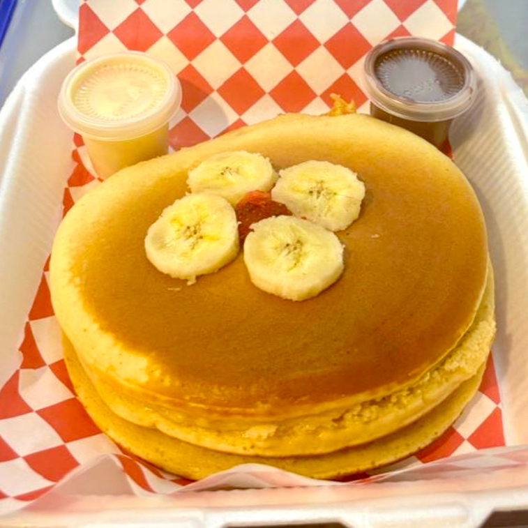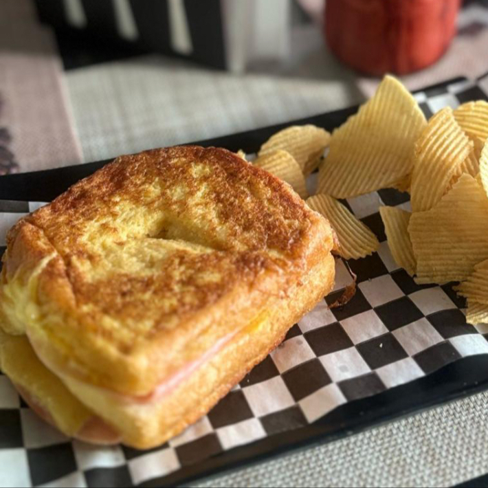 3 rebanadas de pan bimbo con aderezos, rebanadas de jamón de pavo y queso manchego, envuelto en una capa delgada de huevo y tostado