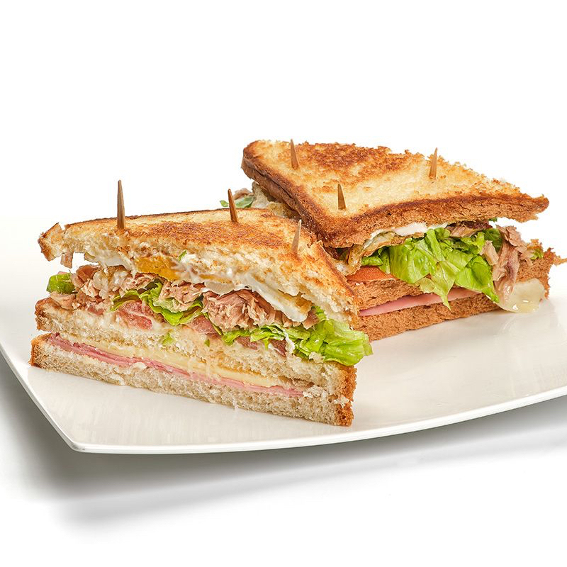 3 rebanadas de pan bimbo con aderezos, rebanadas de jamón de pavo y queso manchego, lechuga, tomate y tostado