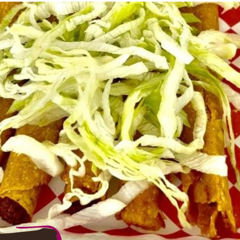 5 tacos dorados de pollo, con lechuga, salsa de tomate, media crema y queso sopero