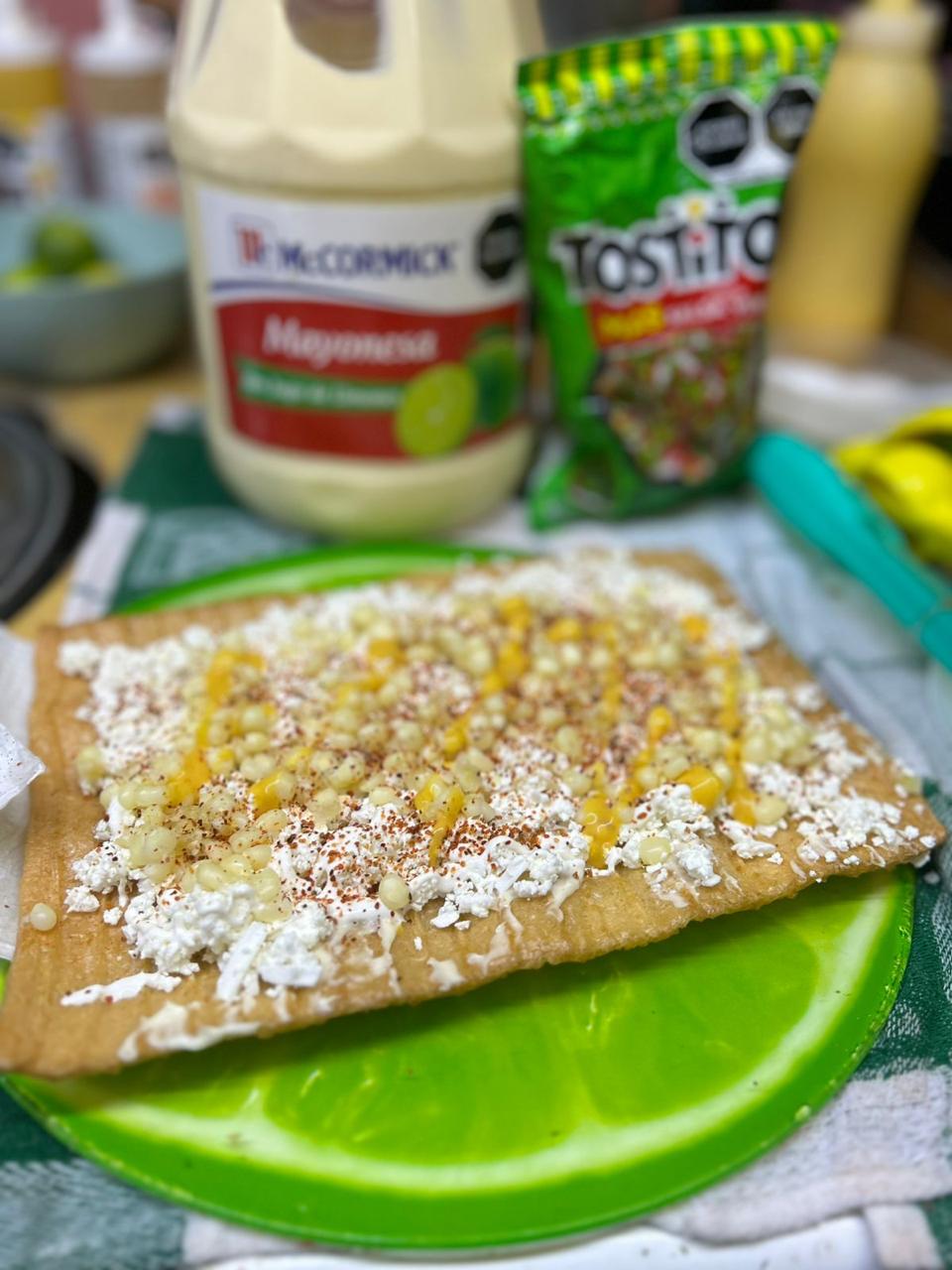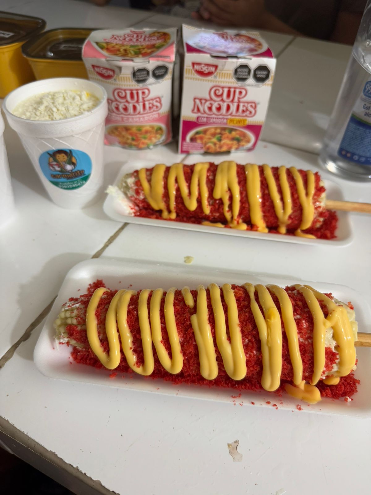 Elote bañado en mayonesa y empanizado con Cheetos Flaming Hot, una explosión de sabor.