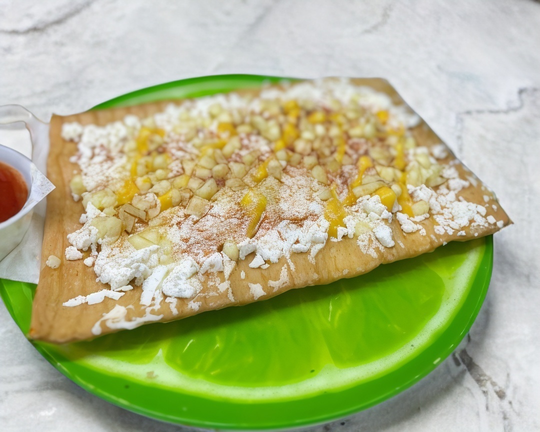 Chicharrones crujientes con crema, queso, salsa y otros complementos.