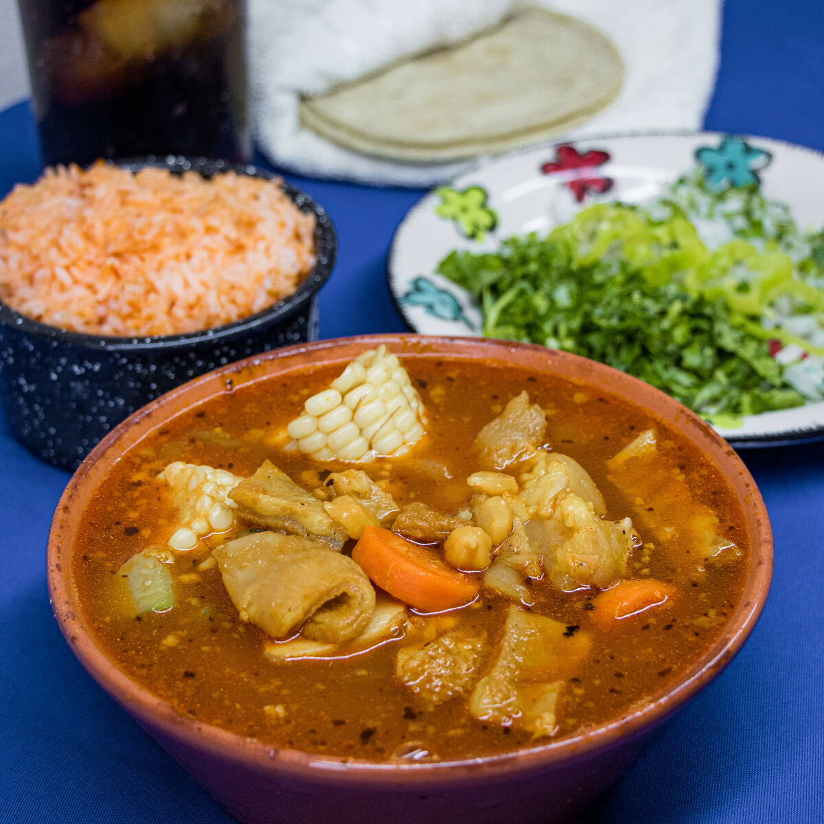 1Lt de caldo de mondongo acompañado de arroz,cebolla y cilantro, limones y tortillas.