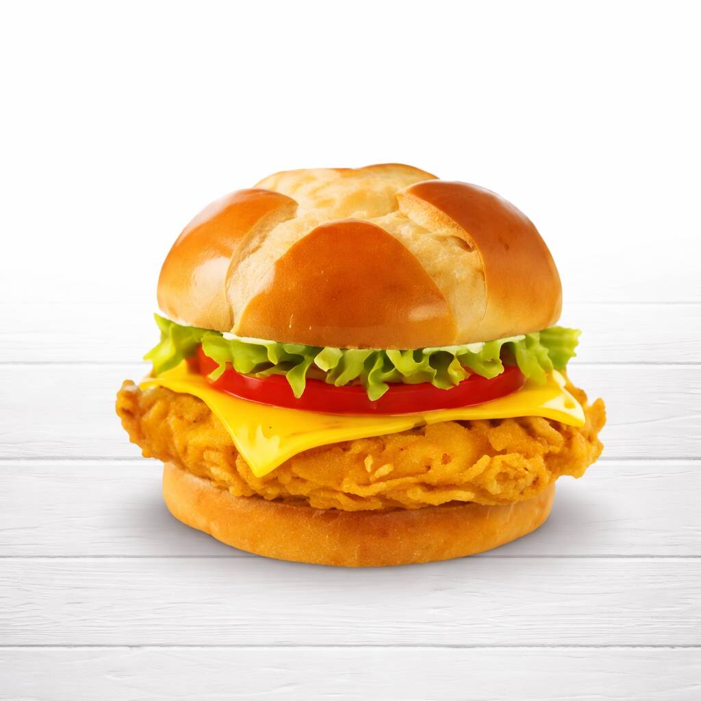 Crujientes tenders de pollo servidos en un suave pan brioche, acompañados de lechuga fresca, rodajas de tomate y queso americano.