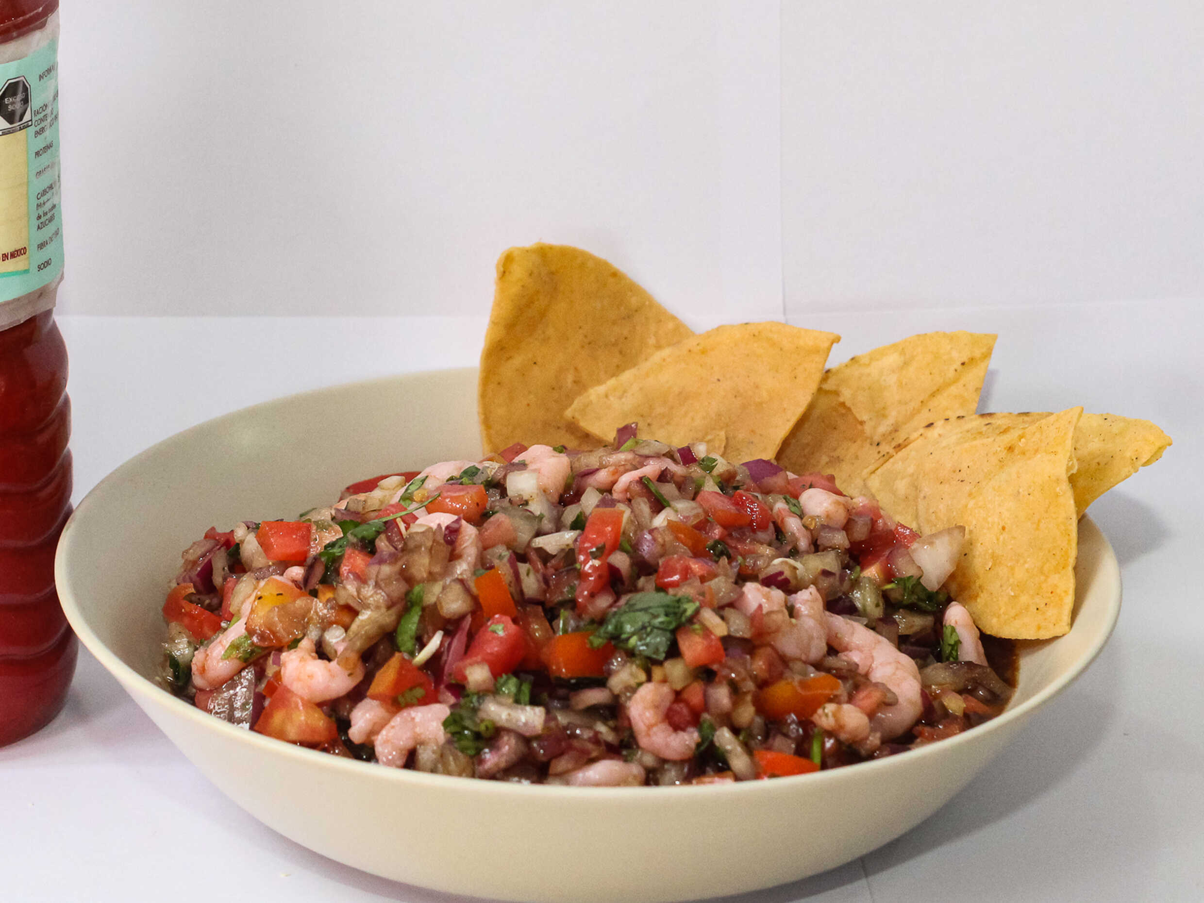 marisco de tu elección preparado con cebolla, cilantro, catsup, sal, pimienta y limon