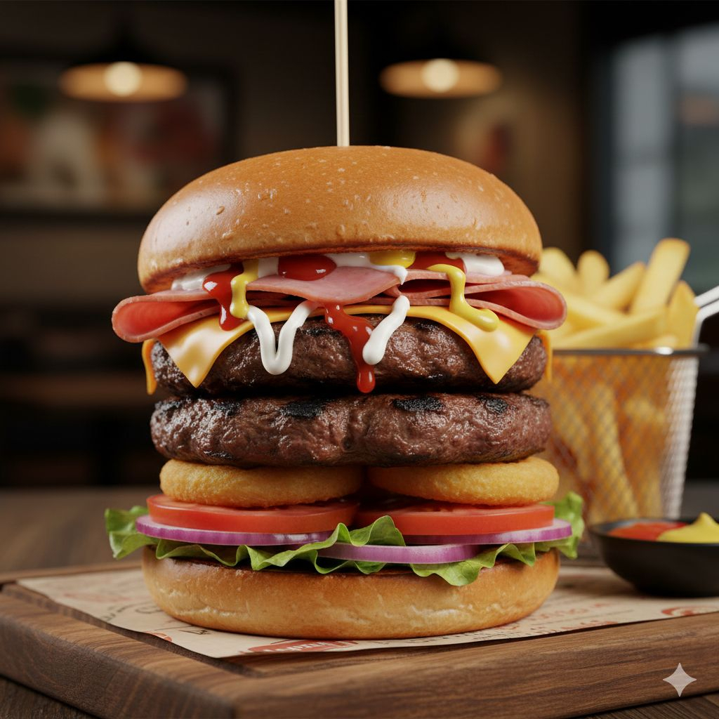 Doble carne de sirloin, pepperoni, tomate, lechuga, cebolla, mayonesa, catsup, mostaza, jamón y queso manchego
