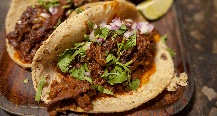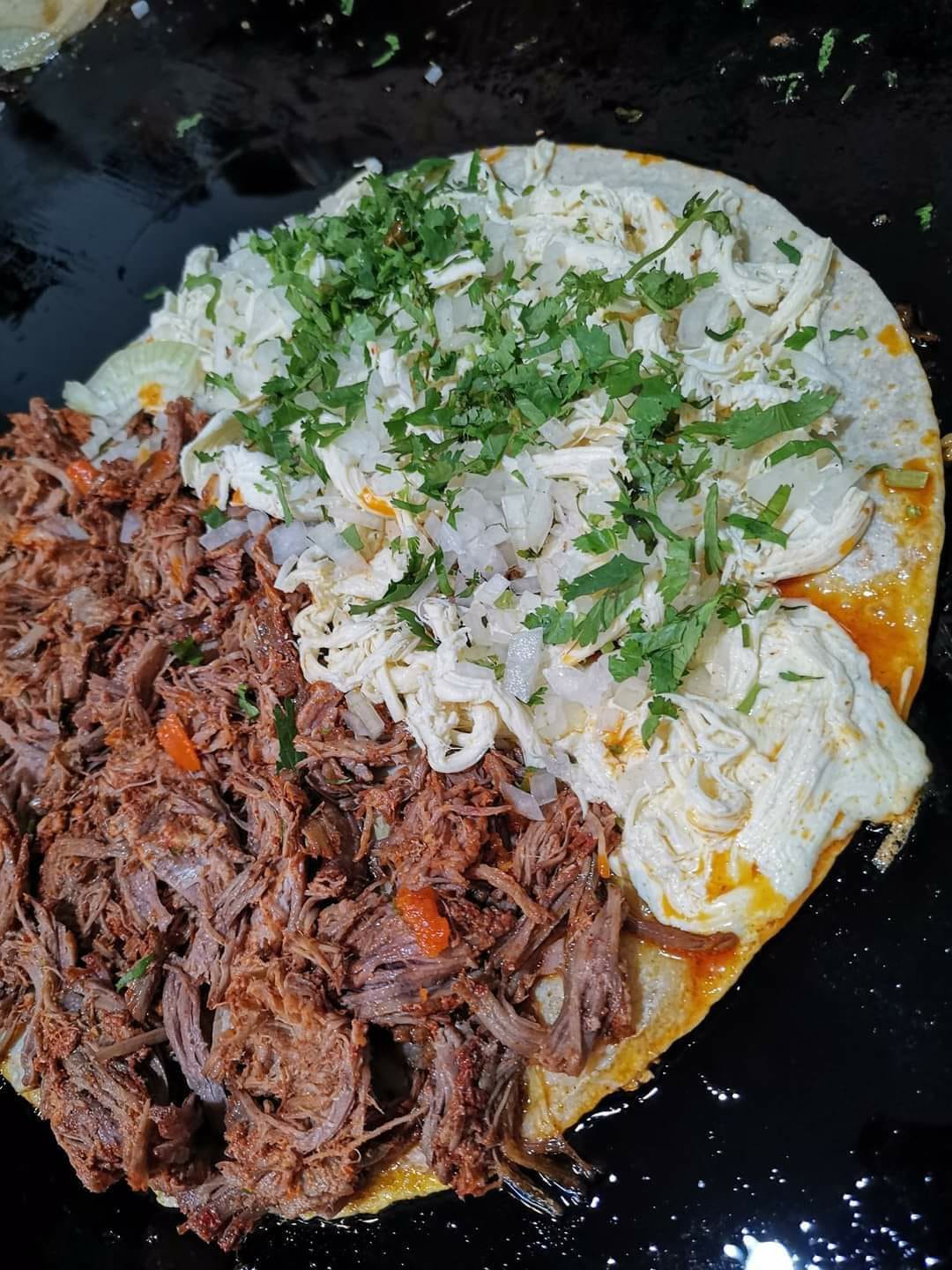 HECHA CON TORTILLA BURRERA DE 35 CM DE DIÁMETRO, 200 GR DE BIRRIA, QUESO DE HEBRA DEL RANCHO DE LA ABUELA, CEBOLLA Y CILANTRO AL GUSTO.