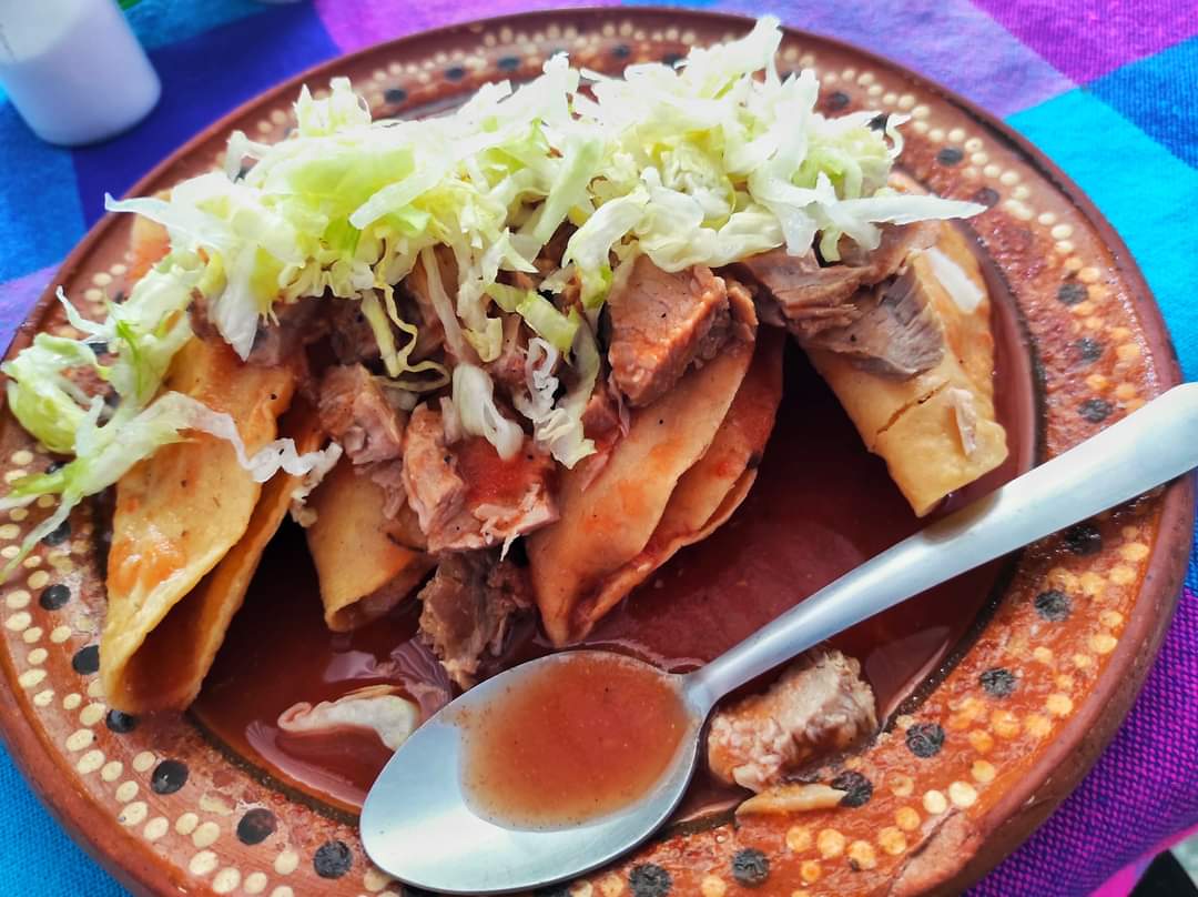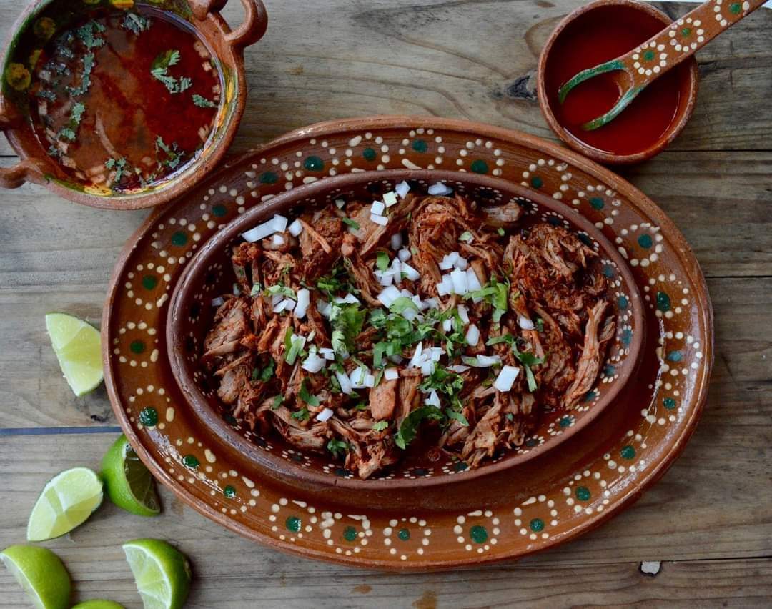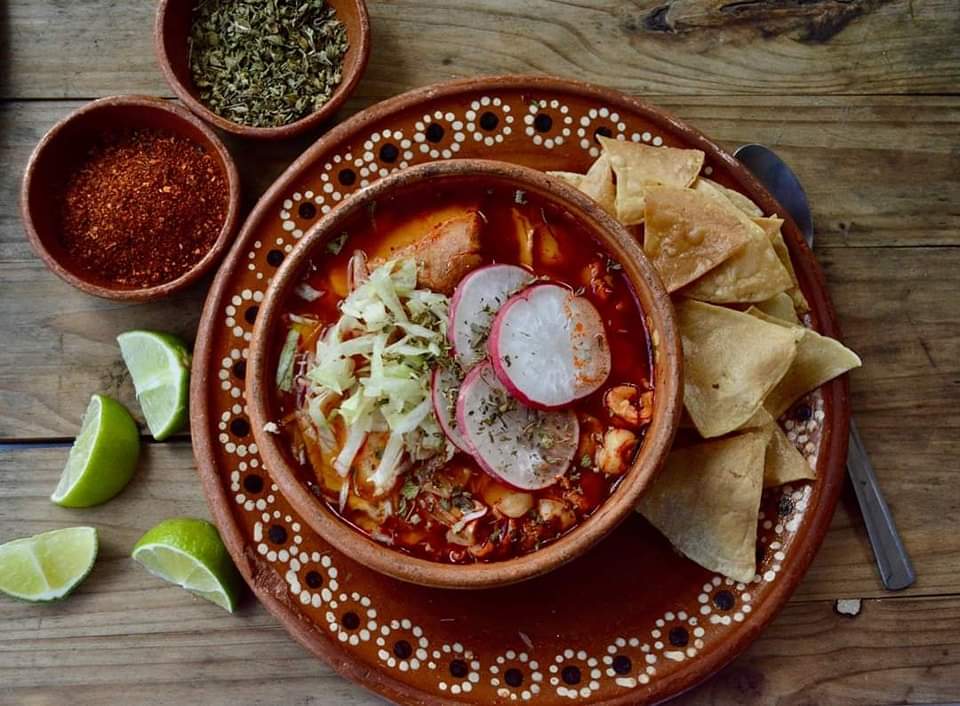 POZOLE ROJO ESTILO JALISCO SERVIDO CON CARNE DE CERDO MAÍZ COMPLEMENTOS: LECHUGA, RÁBANO, CEBOLLA, LIMÓN, PICANTE Y TOTOPOS.