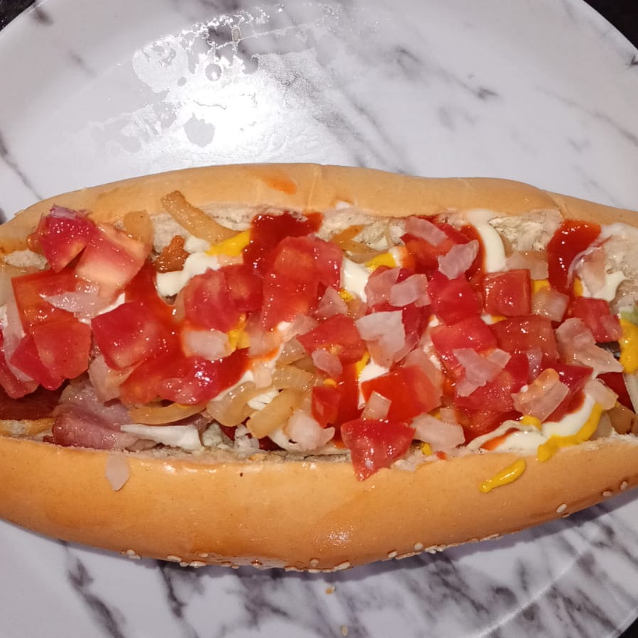 Salchicha asadera, tocino, pico de gallo, casup, mostaza y mayonesa