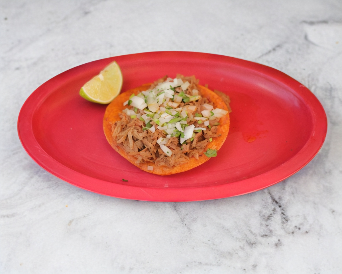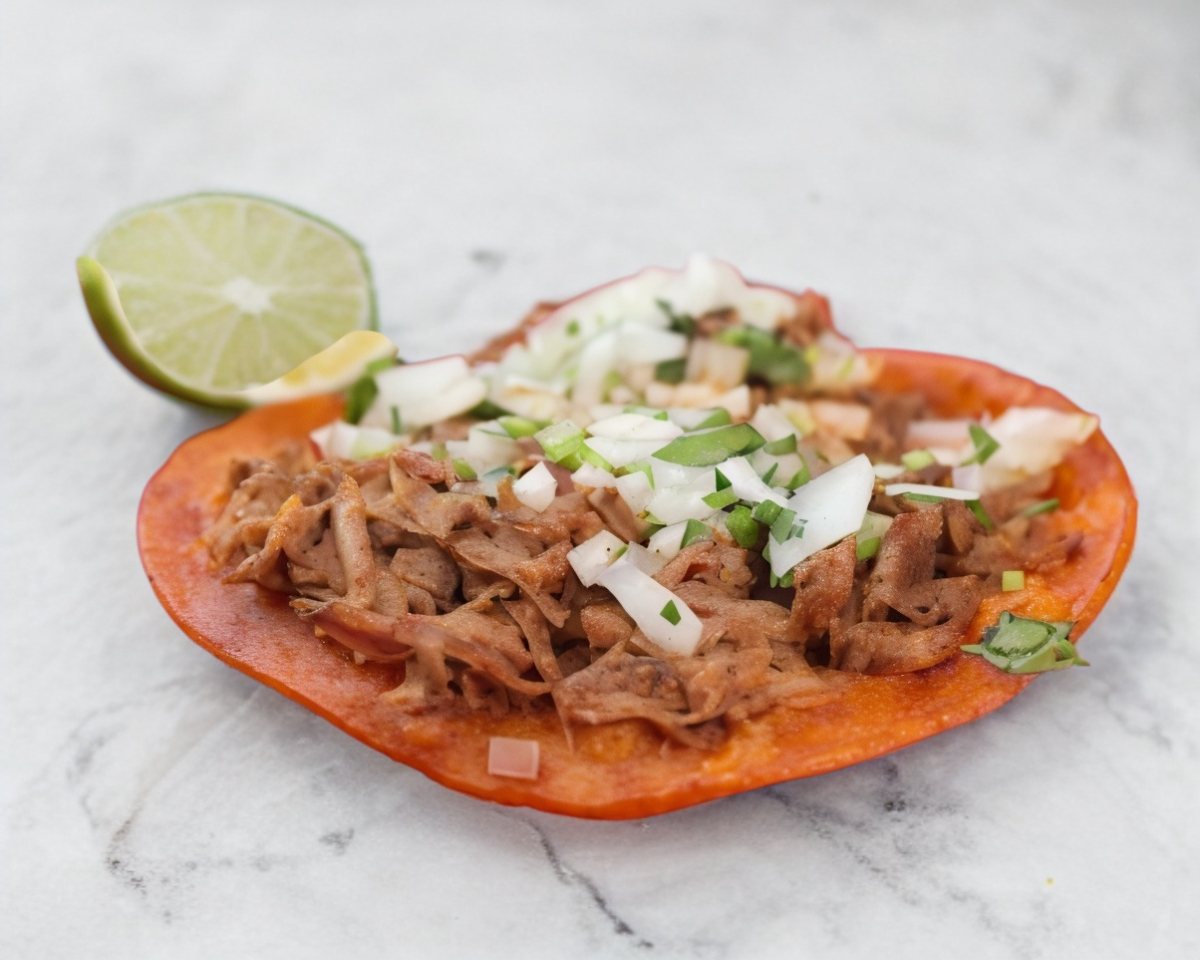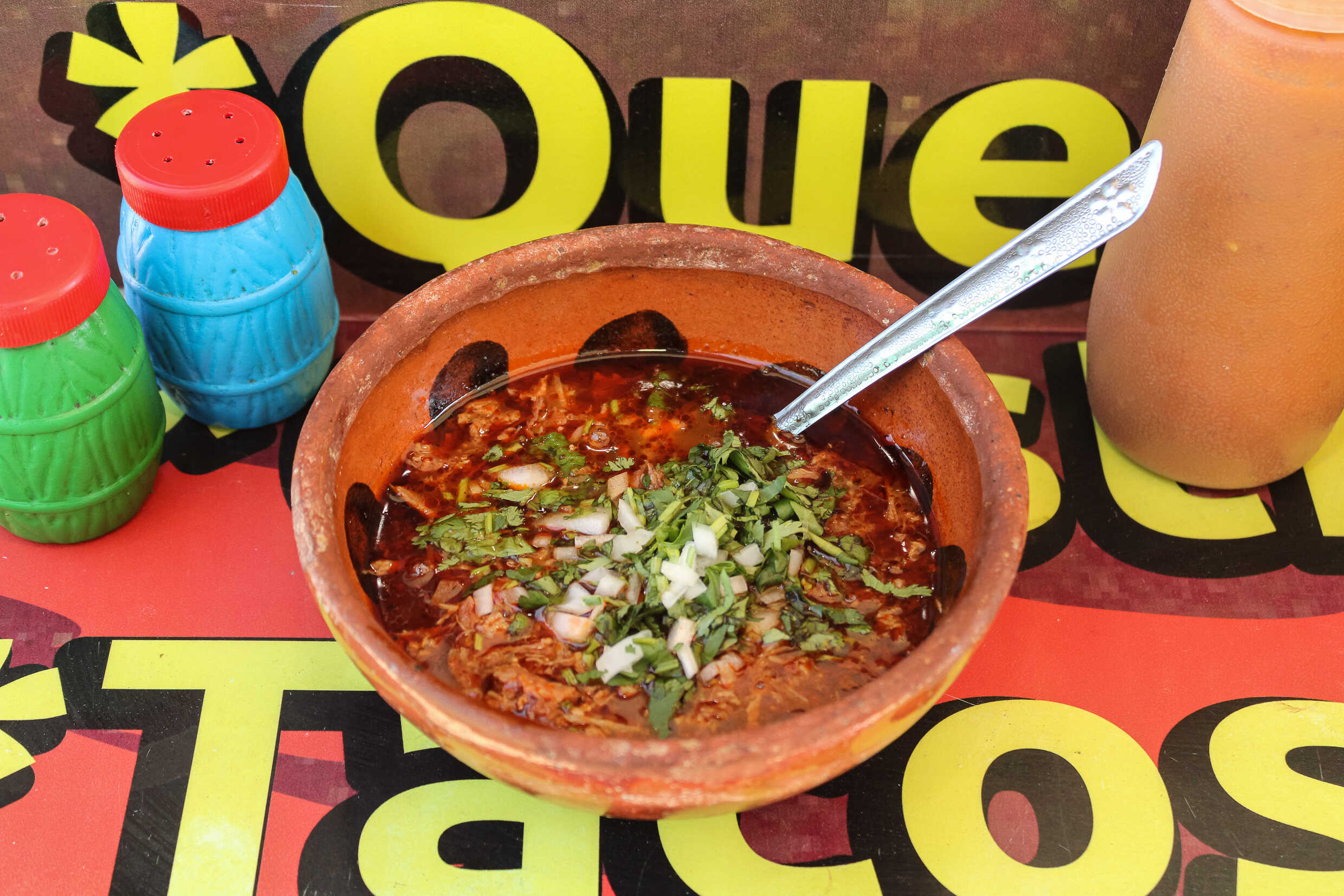 1/2 kilo, 1/2 litro consomé, salsas, tortillas, limones, cebolla y cilantro.