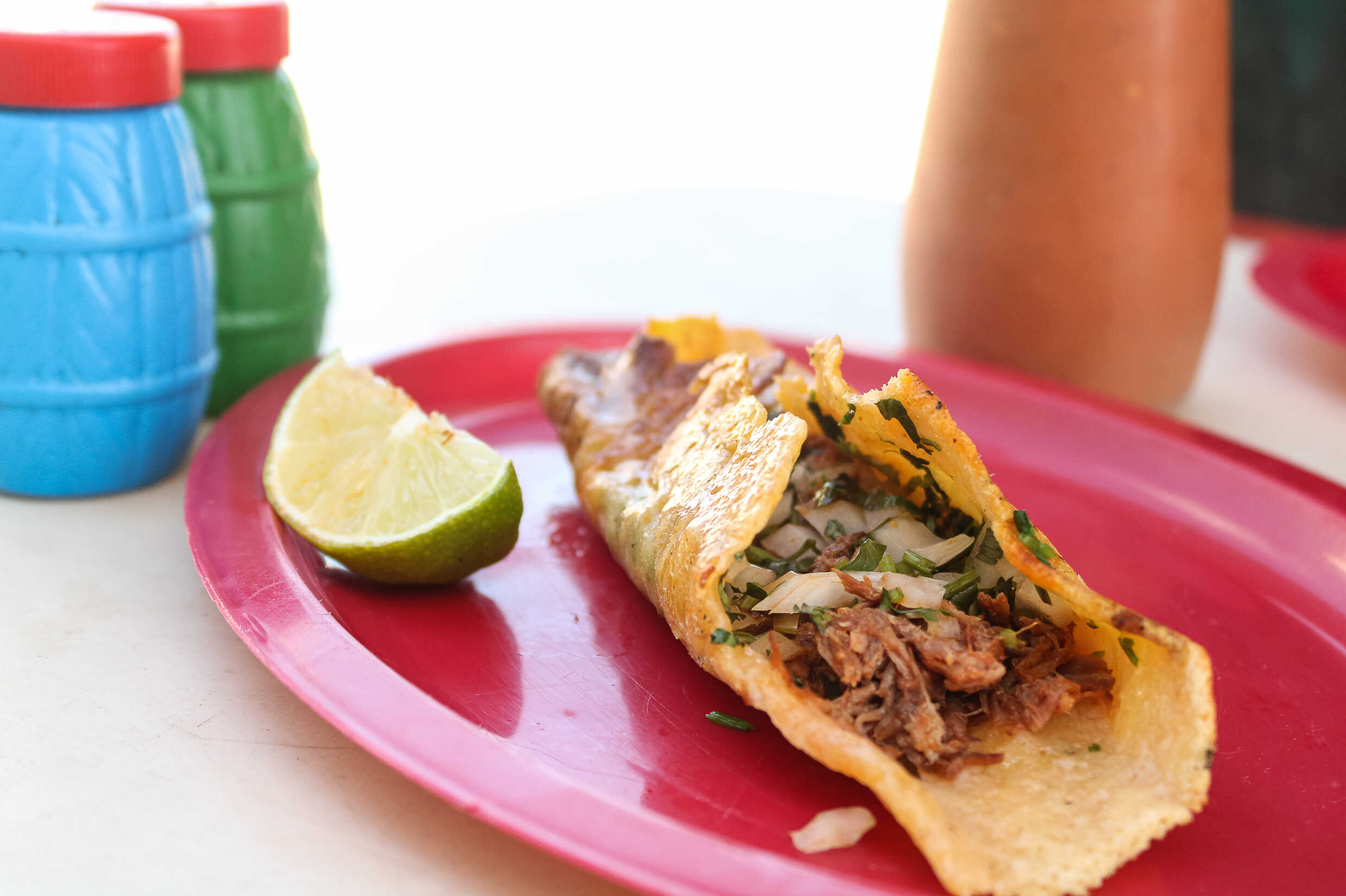 1 taco dorado de birria con cebolla, cilantro y salsas. Incluye un consomé de cortesía.