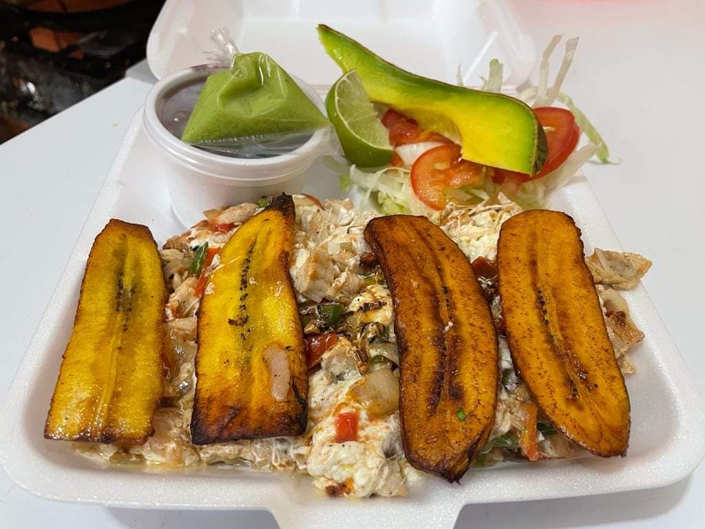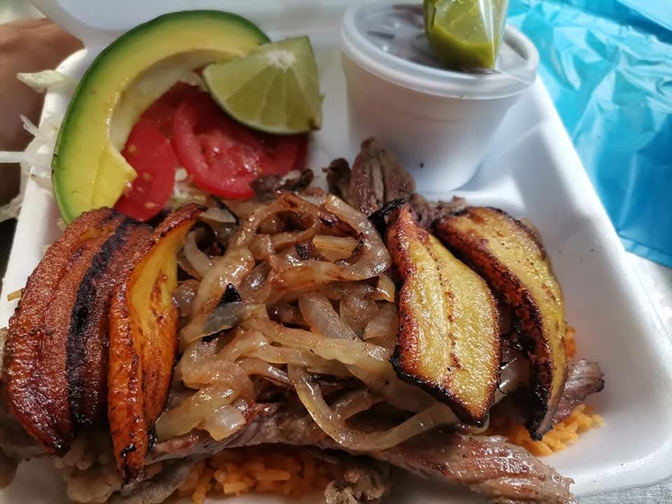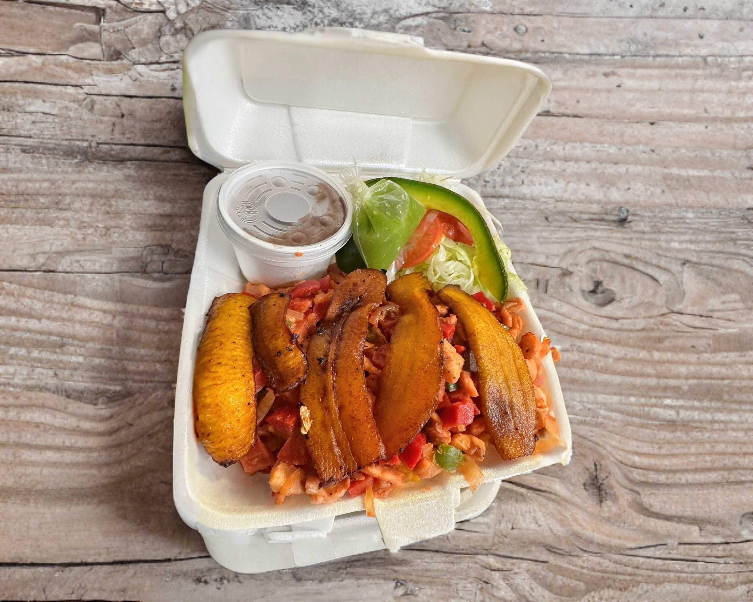 Pechuga con salchicha para asar acompañado de arroz, frijol plátanos fritos y ensalada