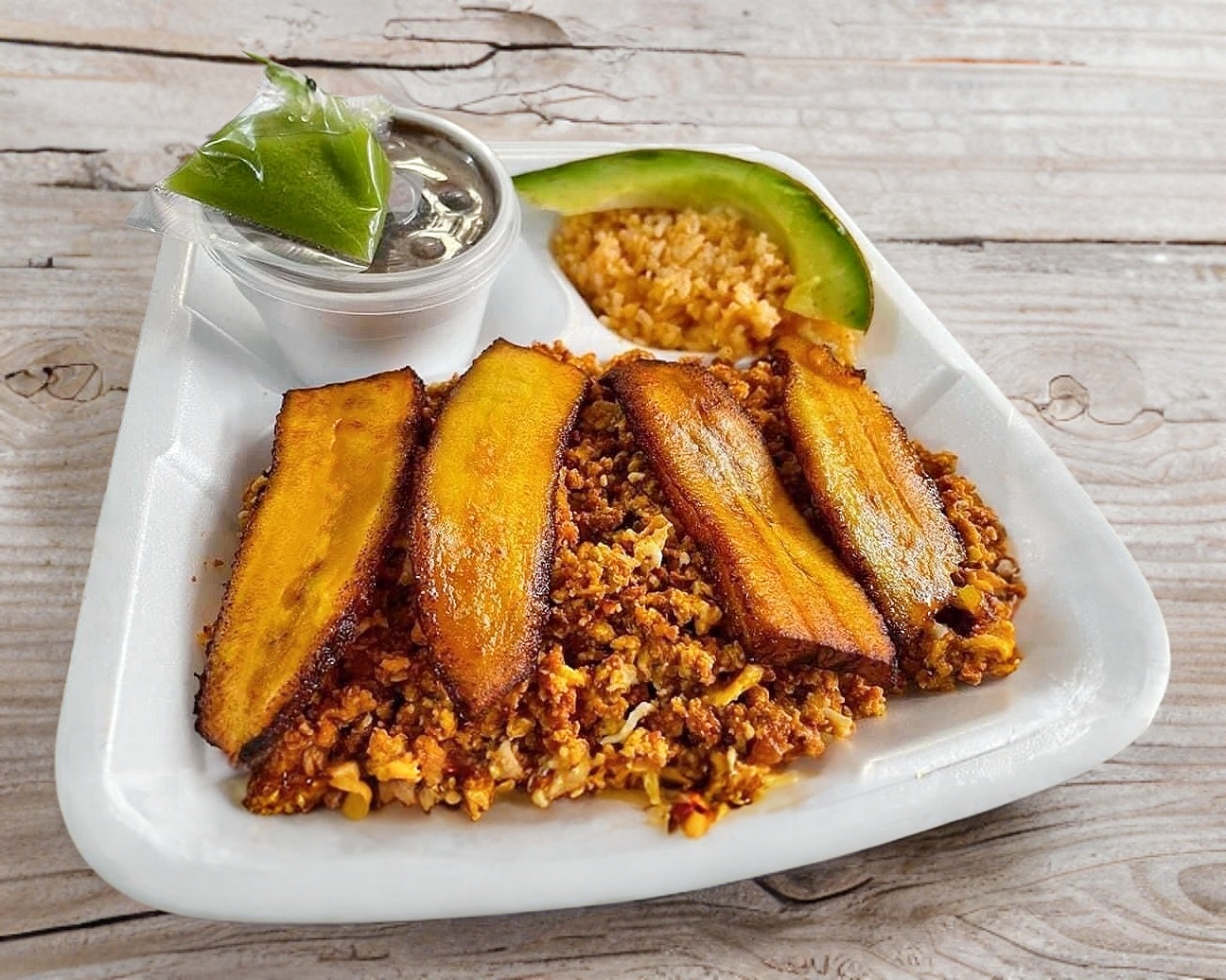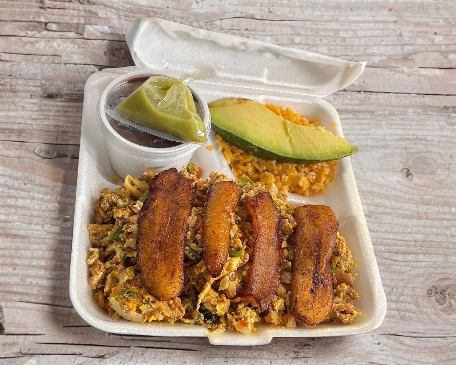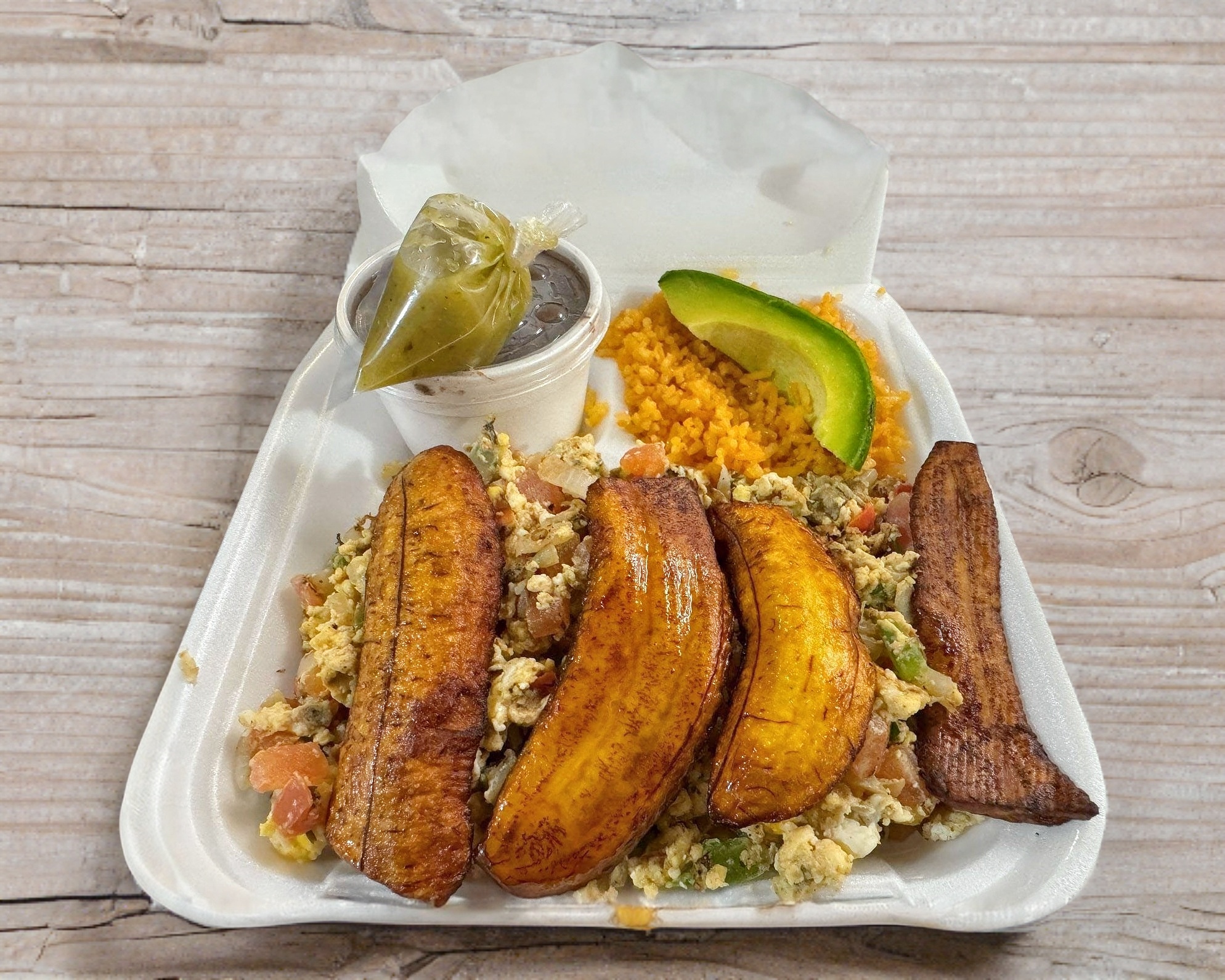 Pechuga con salchicha para asar acompañado de arroz, frijol plátanos fritos y ensalada