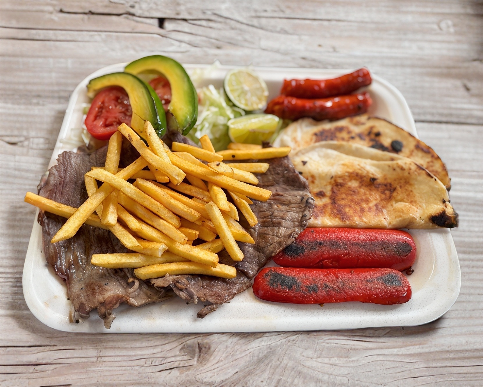 Carmita asada con papas fritas, salchicha para asar, chistorra, quesadillas y ensalada
