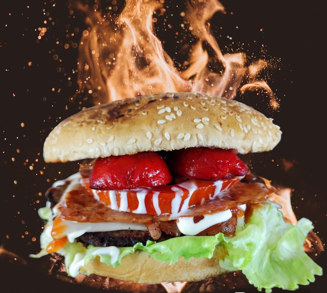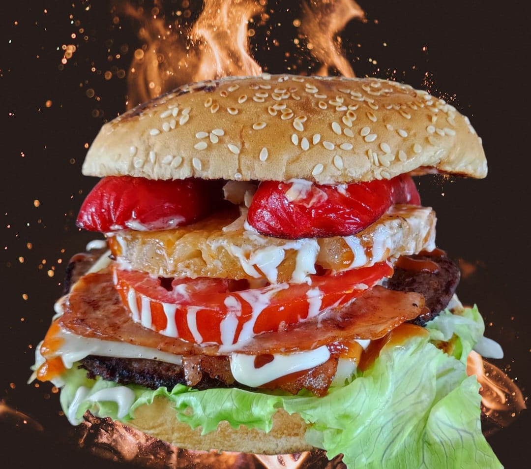 2 carnes, 2 quesos, 2 tocinos, salchicha para asar, piña, lechuga, tomate, cebolla caramelizada, catsup, mayonesa.