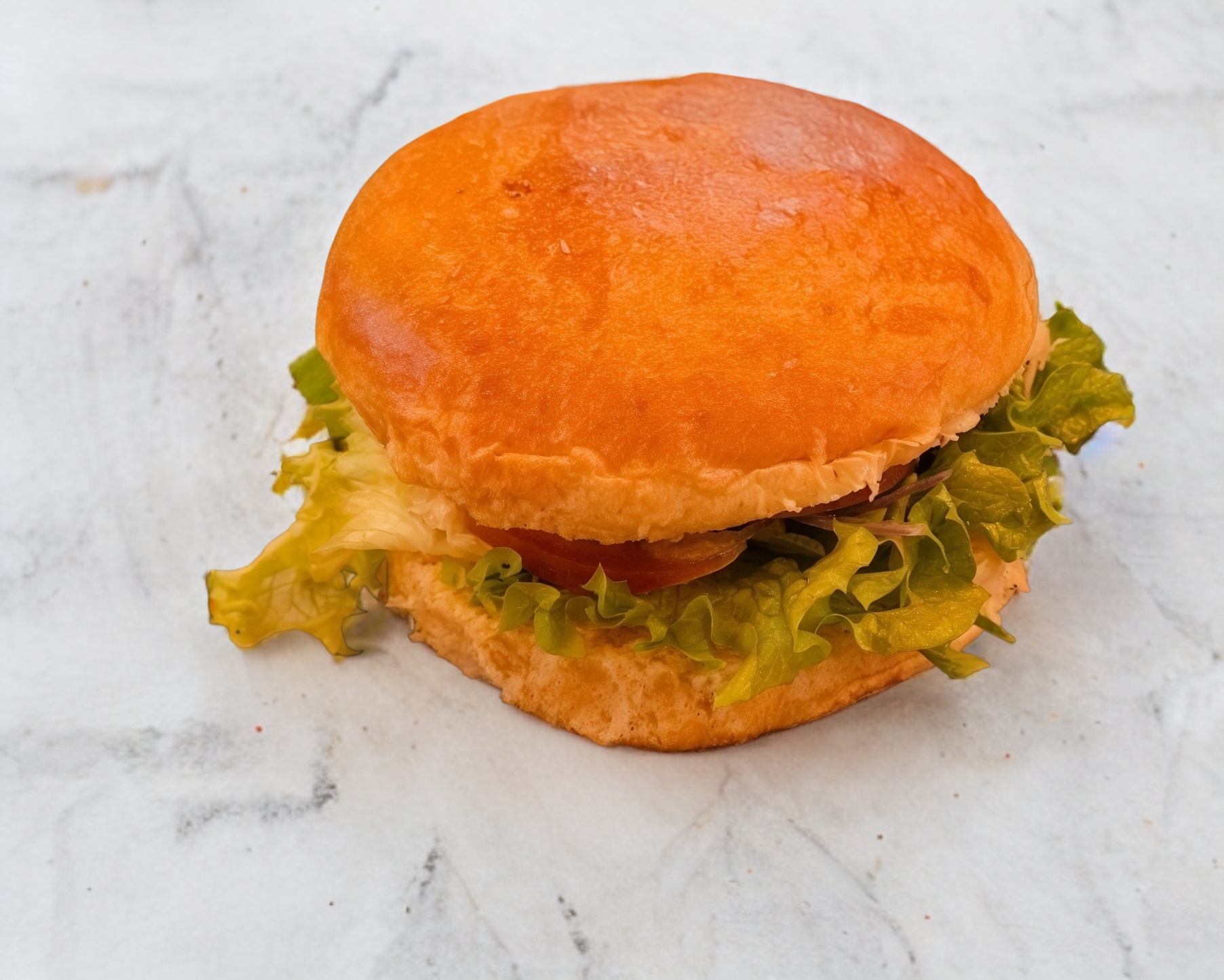 Pan brioche, carne de hamburguesa, lechuga, tomate, cebolla y queso amarillo. SIN PAPAS