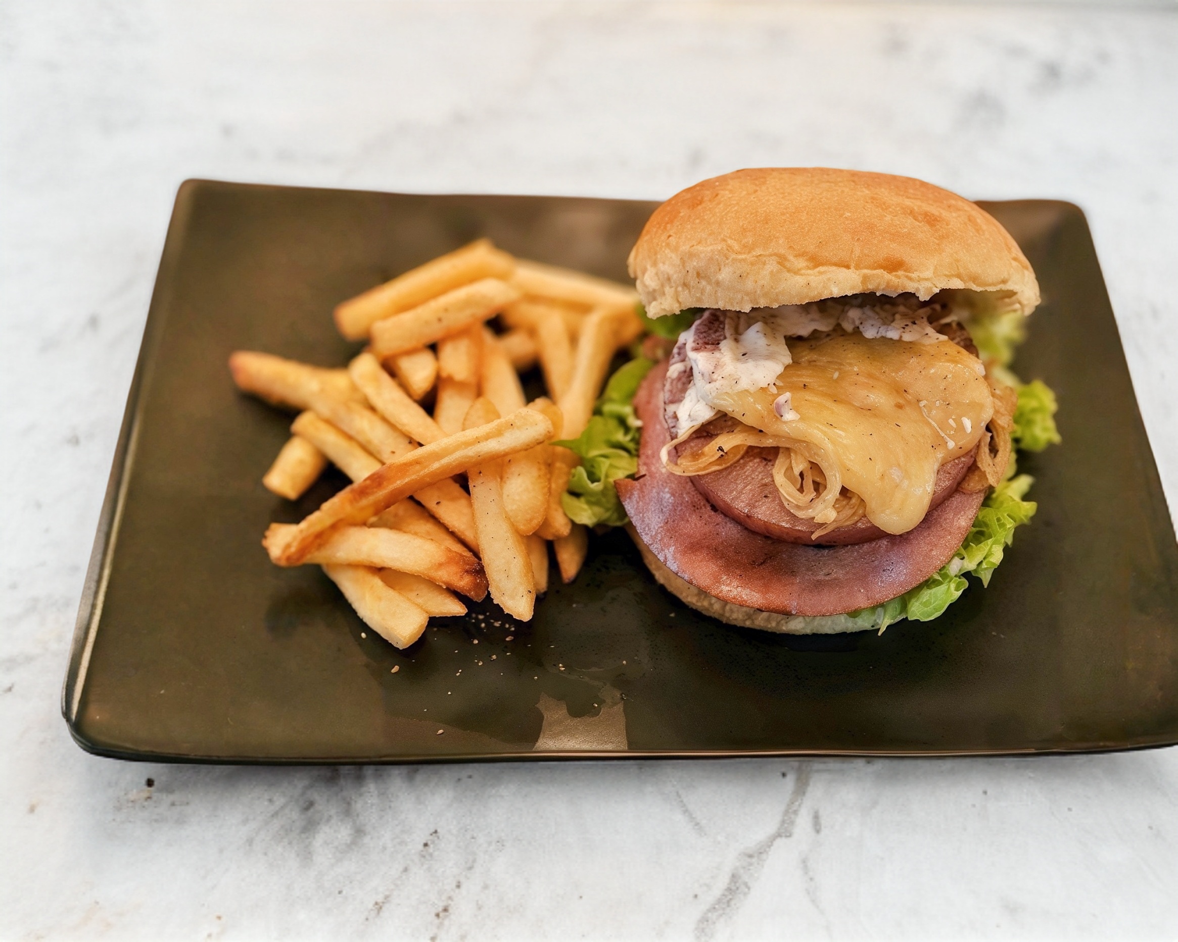 150 gr de top sirloin 100% casera, jamón de pavo, queso gouda, cebolla morada, tomate bola, dentro de nuestro pan brioche, acompañada de papas.