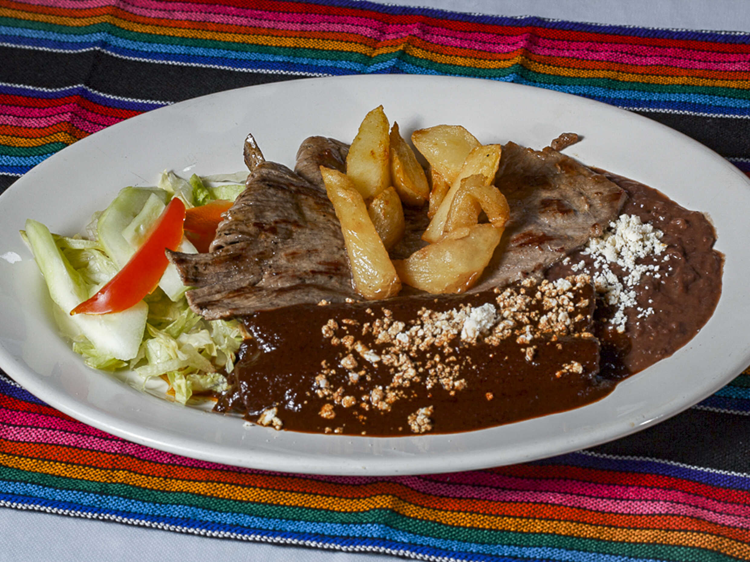 Acompañada de dos enchiladas, papas, frijol, papas y ensalada.