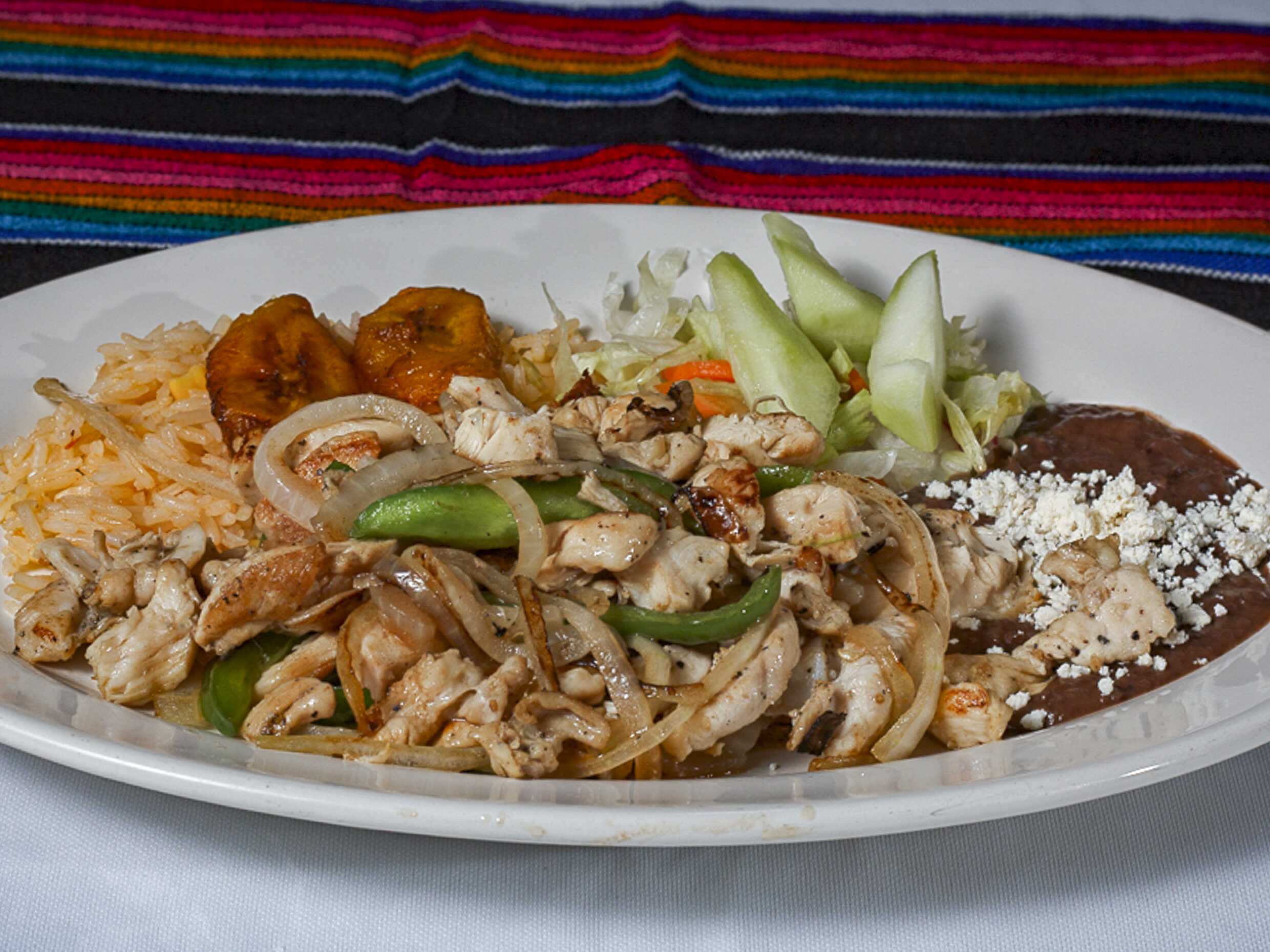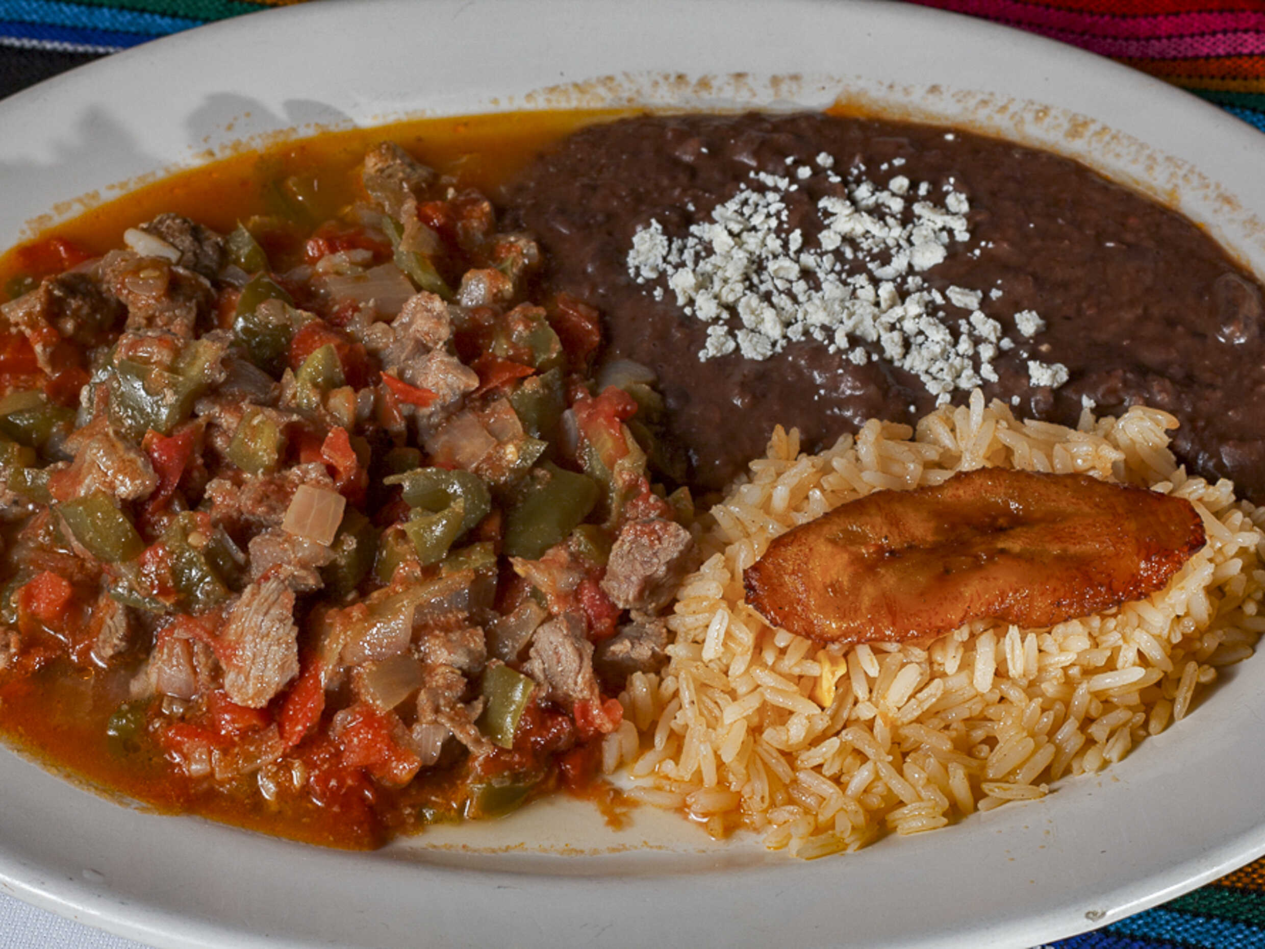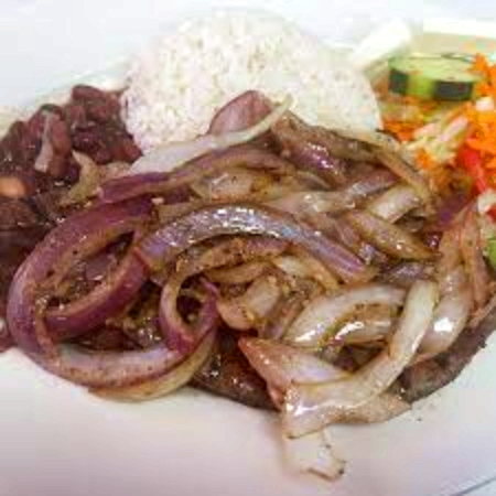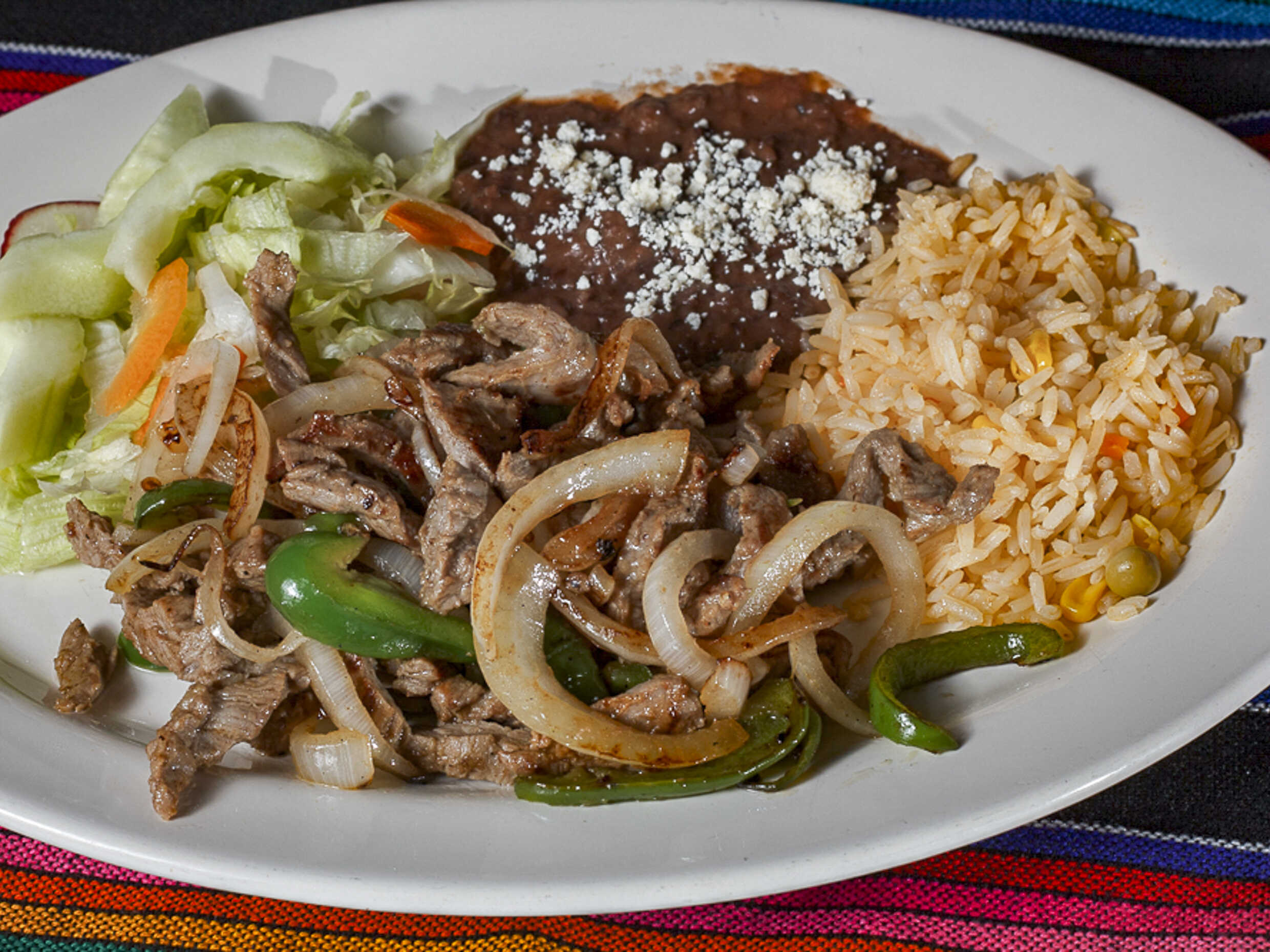 Carne picada con cebolla, pimiento morrón verde, jamón, tortilla de maíz, acompañada de frijoles y ensalada.