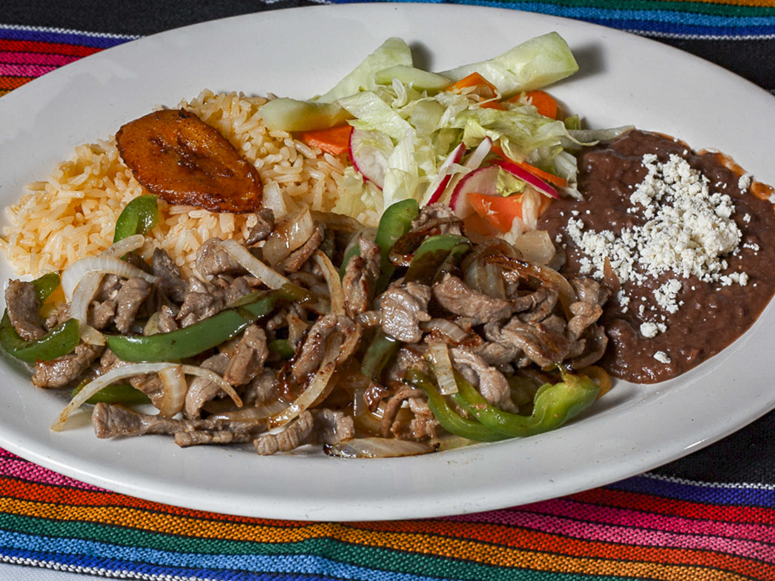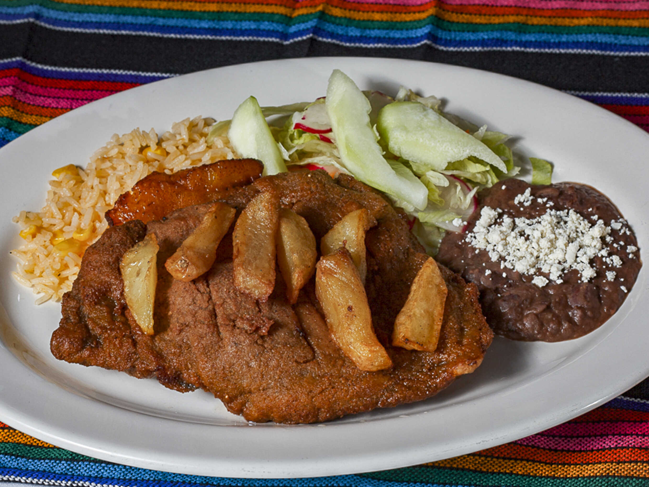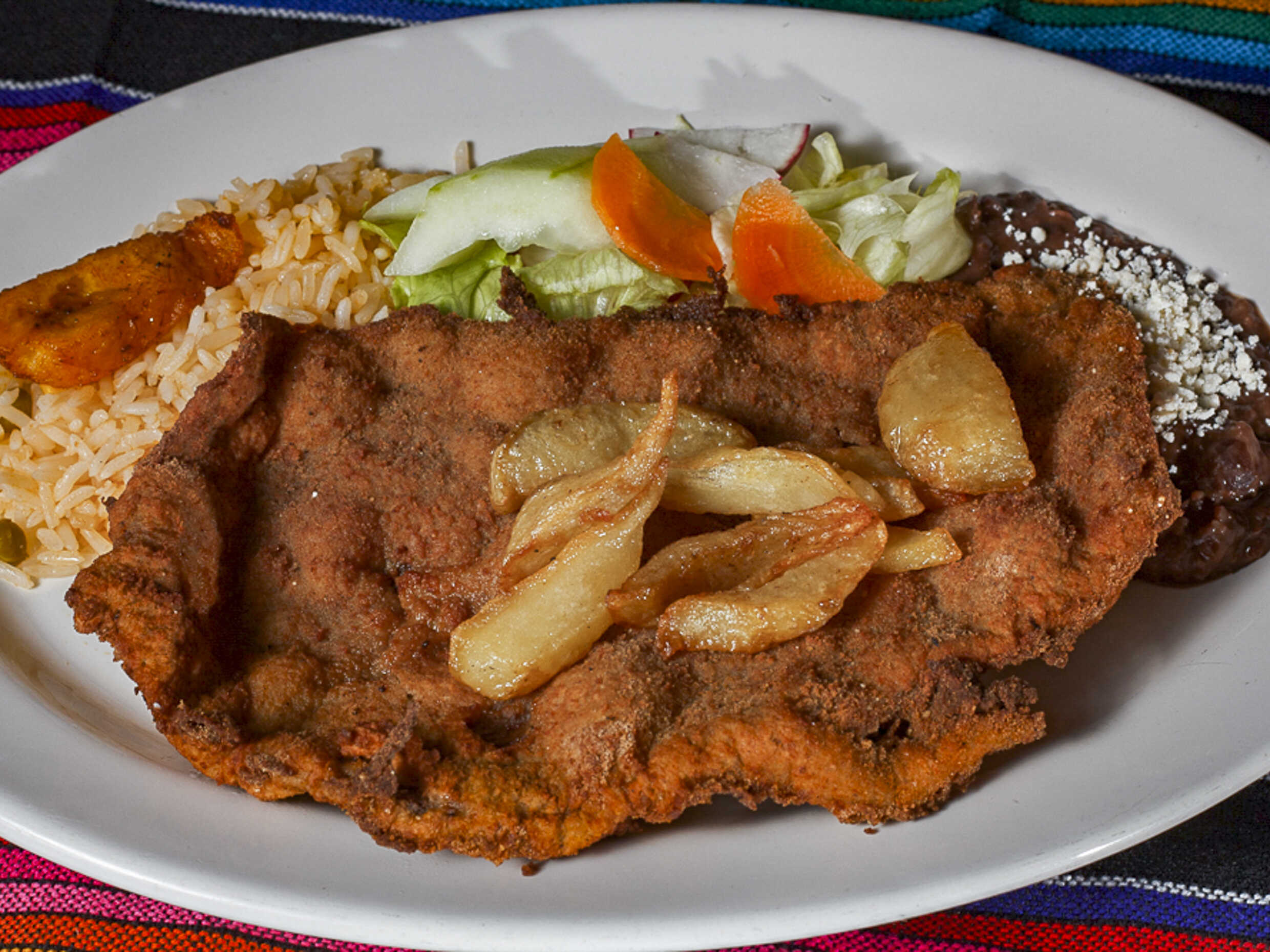 Filete de res empanizado y frito, acompañada de frijoles, papas y ensalada.