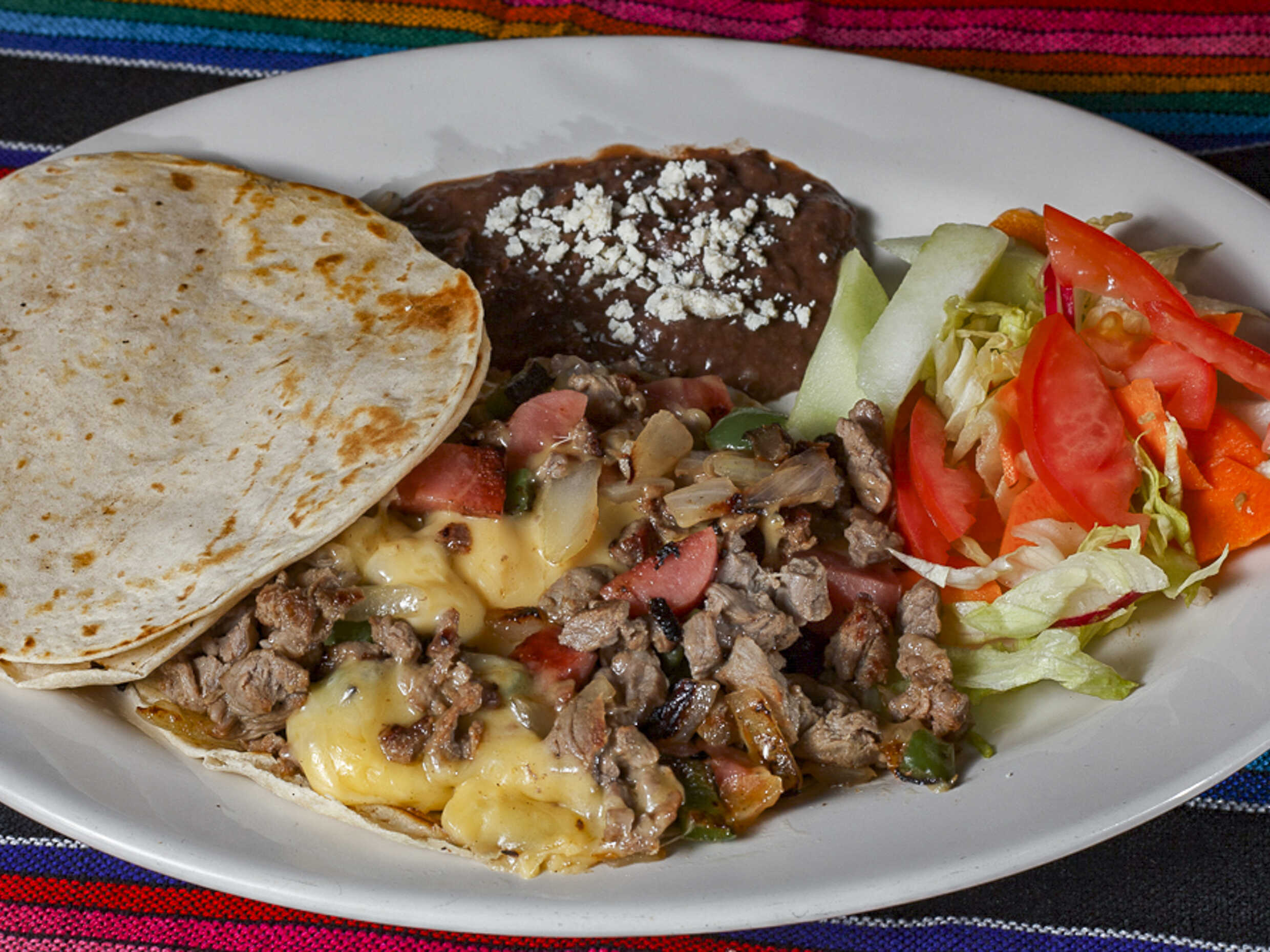 Carne picada con cebolla, pimiento morrón verde, jamón, queso, tortilla de harina, acompañada de frijoles y ensalada.