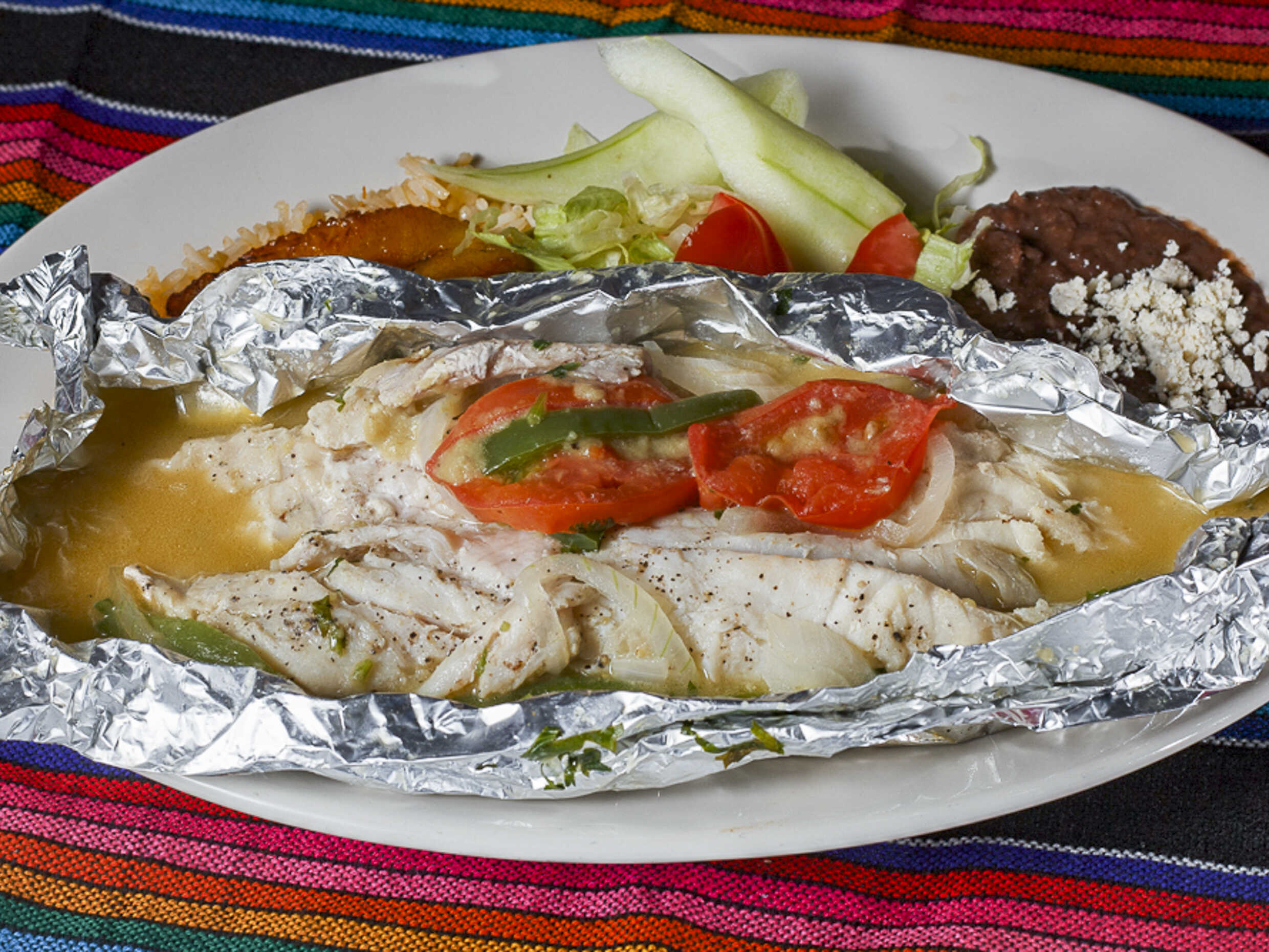 Empapelado con tomate, cebolla, pimiento morrón verde, crema de ajo, acompañada de frijoles y ensalada.