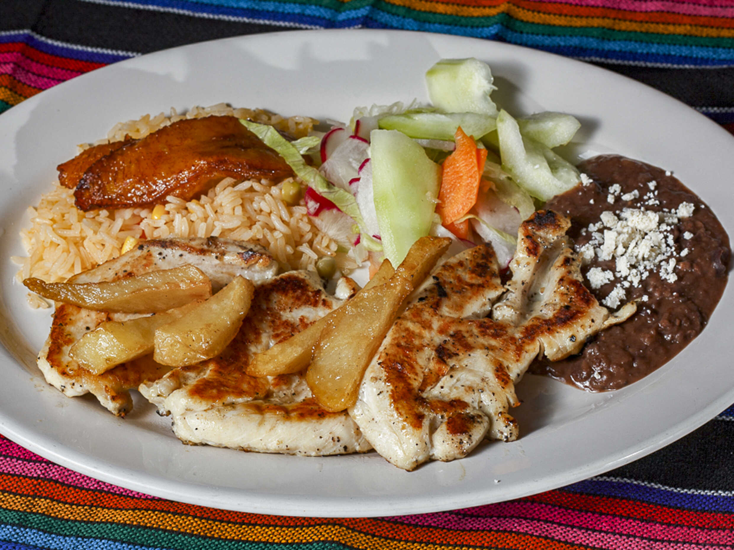 1 pieza de pollo marinada, empanizada y frita, acompañada de frijoles, papas y ensalada.