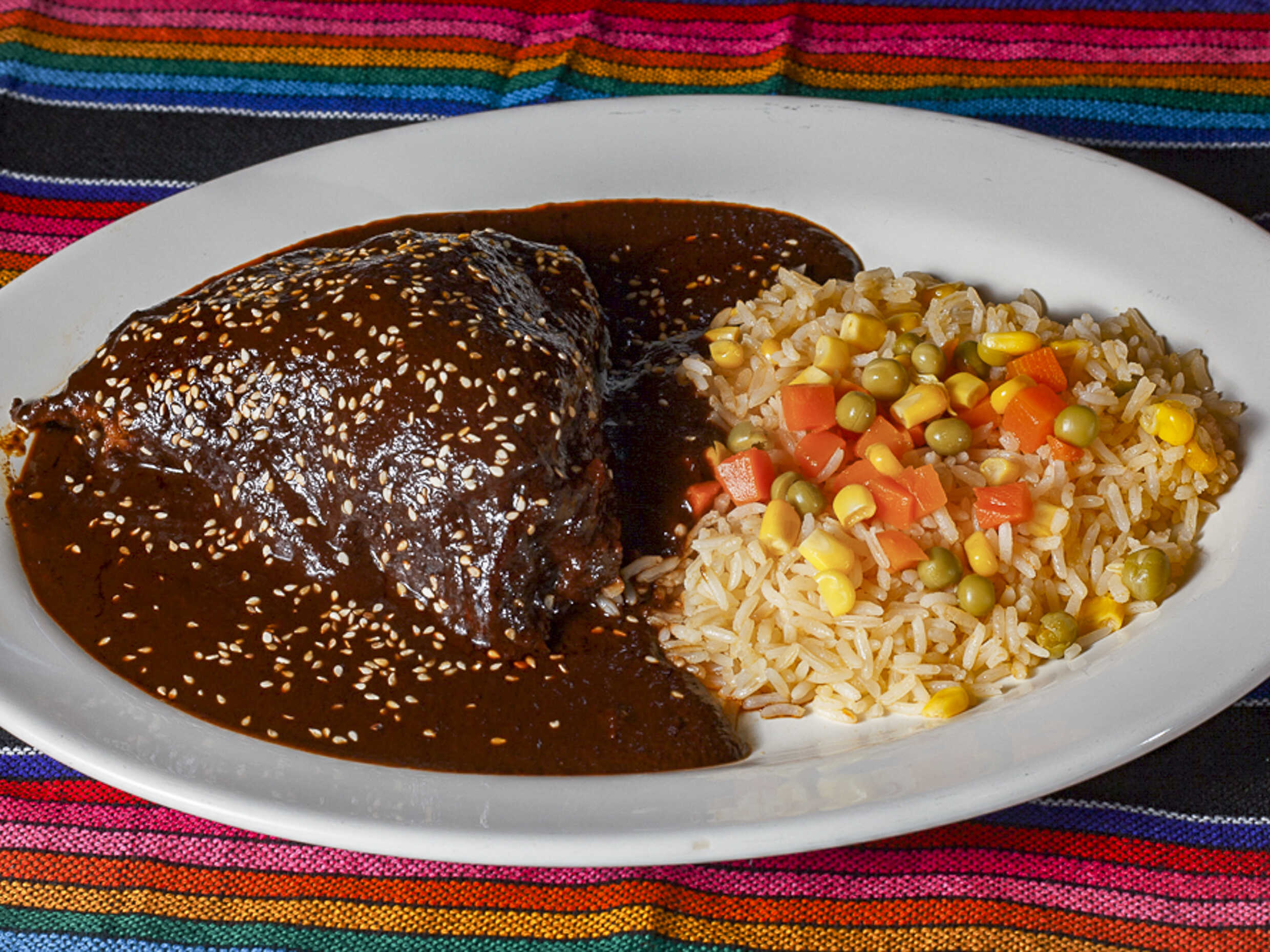 Con tortilla de harina rellenas de pollo, bañadas en salsa roja con queso gratinado.