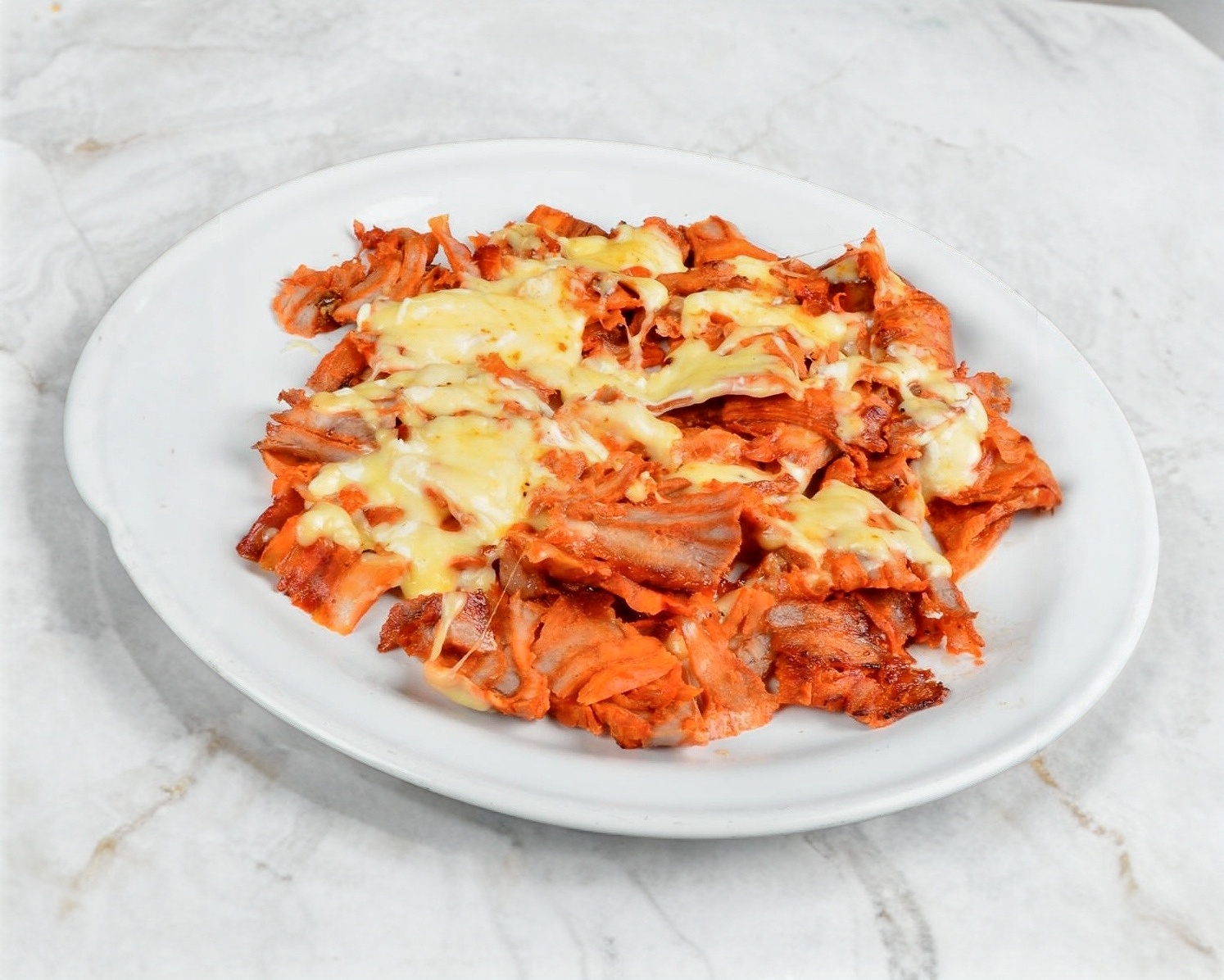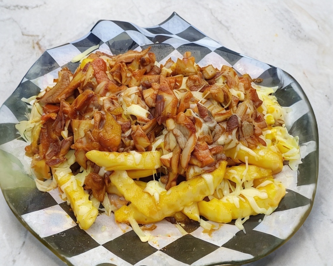 Cama de papas fritas con topping de 200grs de carne de pastor y queso