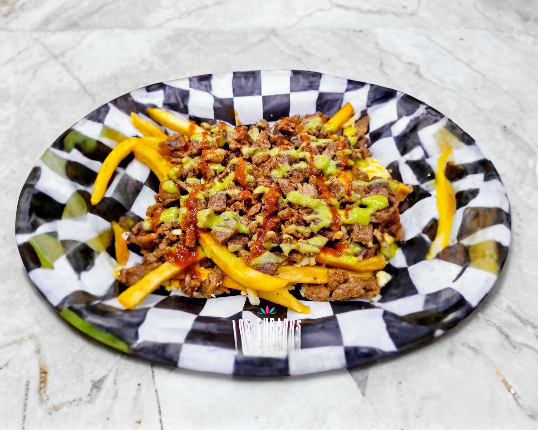 Tortilla de harina jumbo con carne al pastor y bistec de res (150grs), frijol, queso, crema, cebolla caramelizada. Acompañado de porción de papas a la francesa.