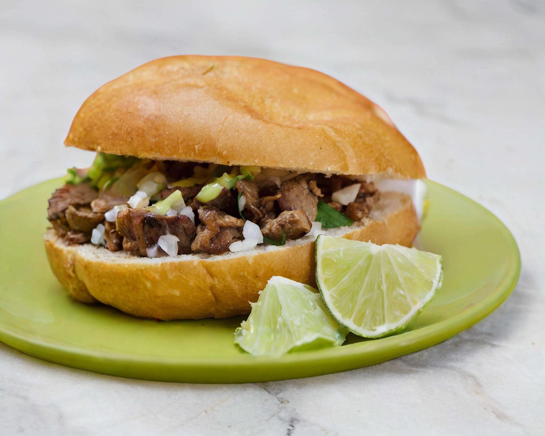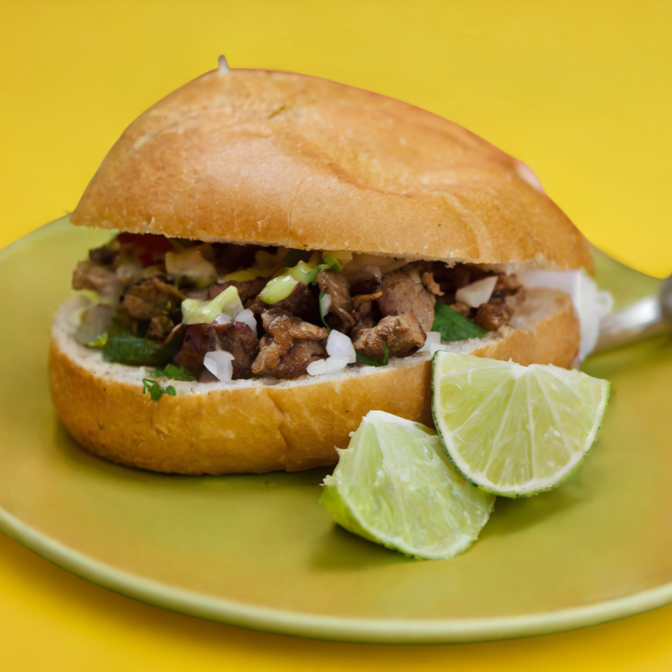 Pan de telera con carne de bistec de res. Acompañada de cebolla con cilantro, salsa verde, roja y limones.