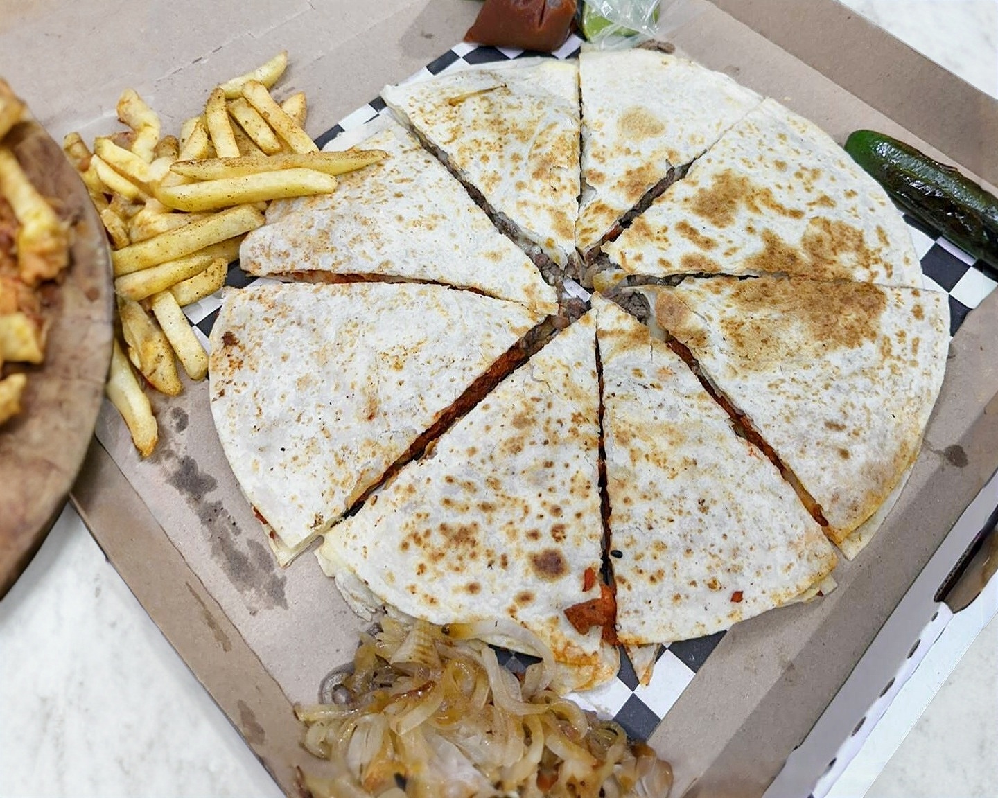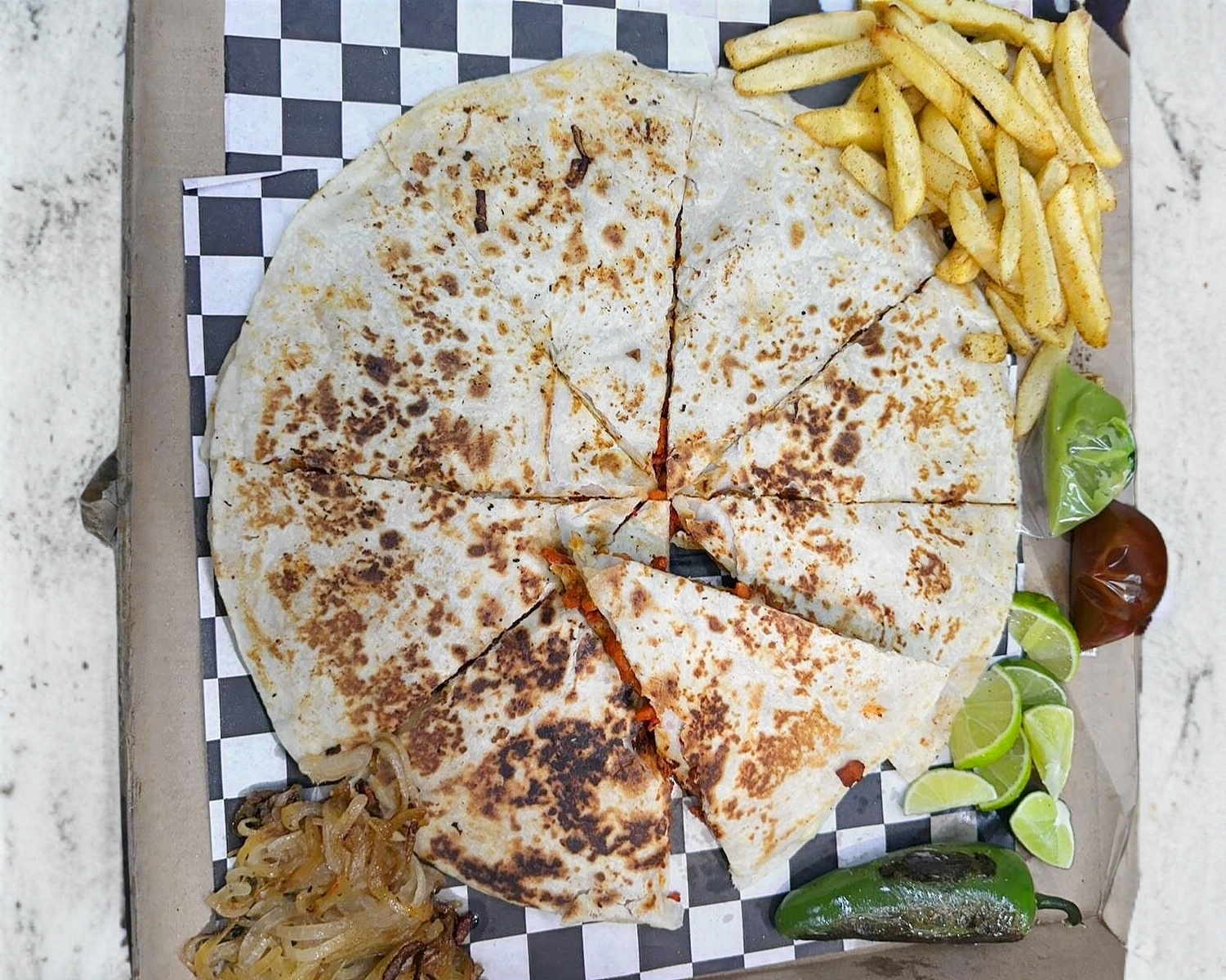 Gringa de tortilla de harina jumbo, acompañada de papas a la francesa, cebolla caramelizada, chile toreado y salsas.