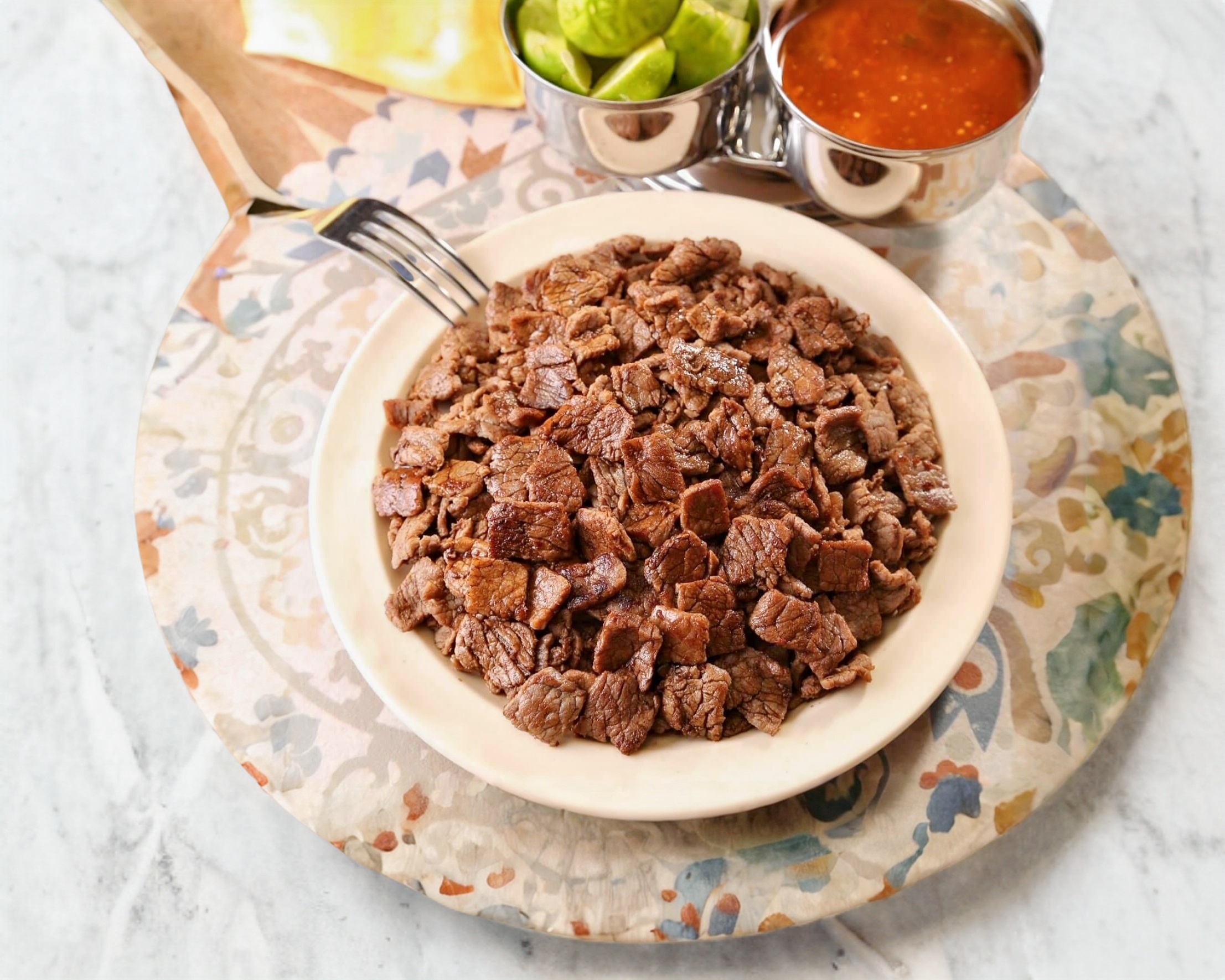 200 grs de carne de pastor y bistec con queso. Acompañado de tortillas, salsas, limon, cebolla y cilantro.