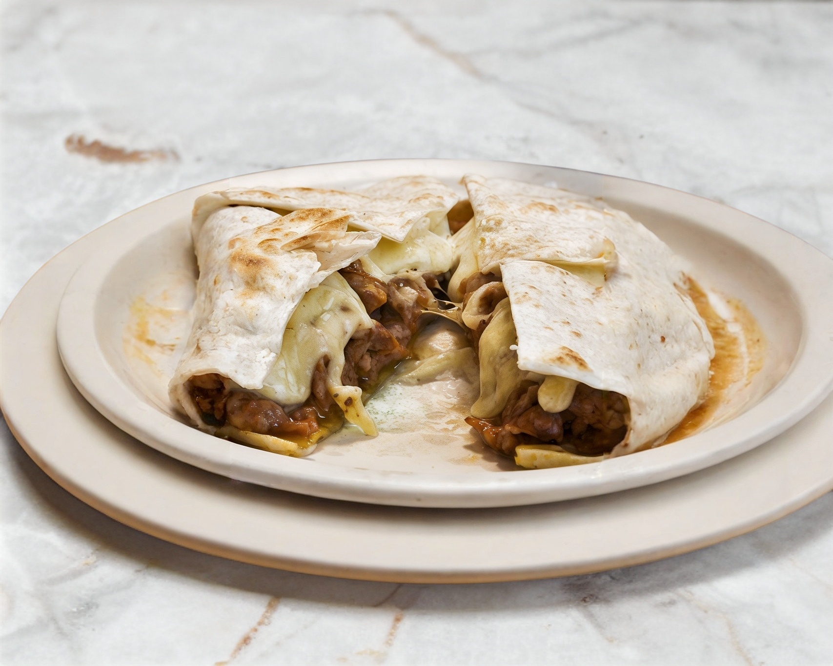 Costra de queso mozzarella con carne de bistec de res, acompañada de tortillas de maíz.