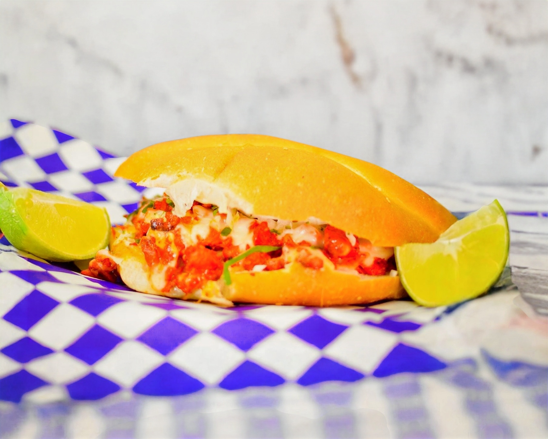 Pan de telera con carne de pastor y bistec de res con queso. Acompañada de cebolla con cilantro, salsa verde, roja y limones.