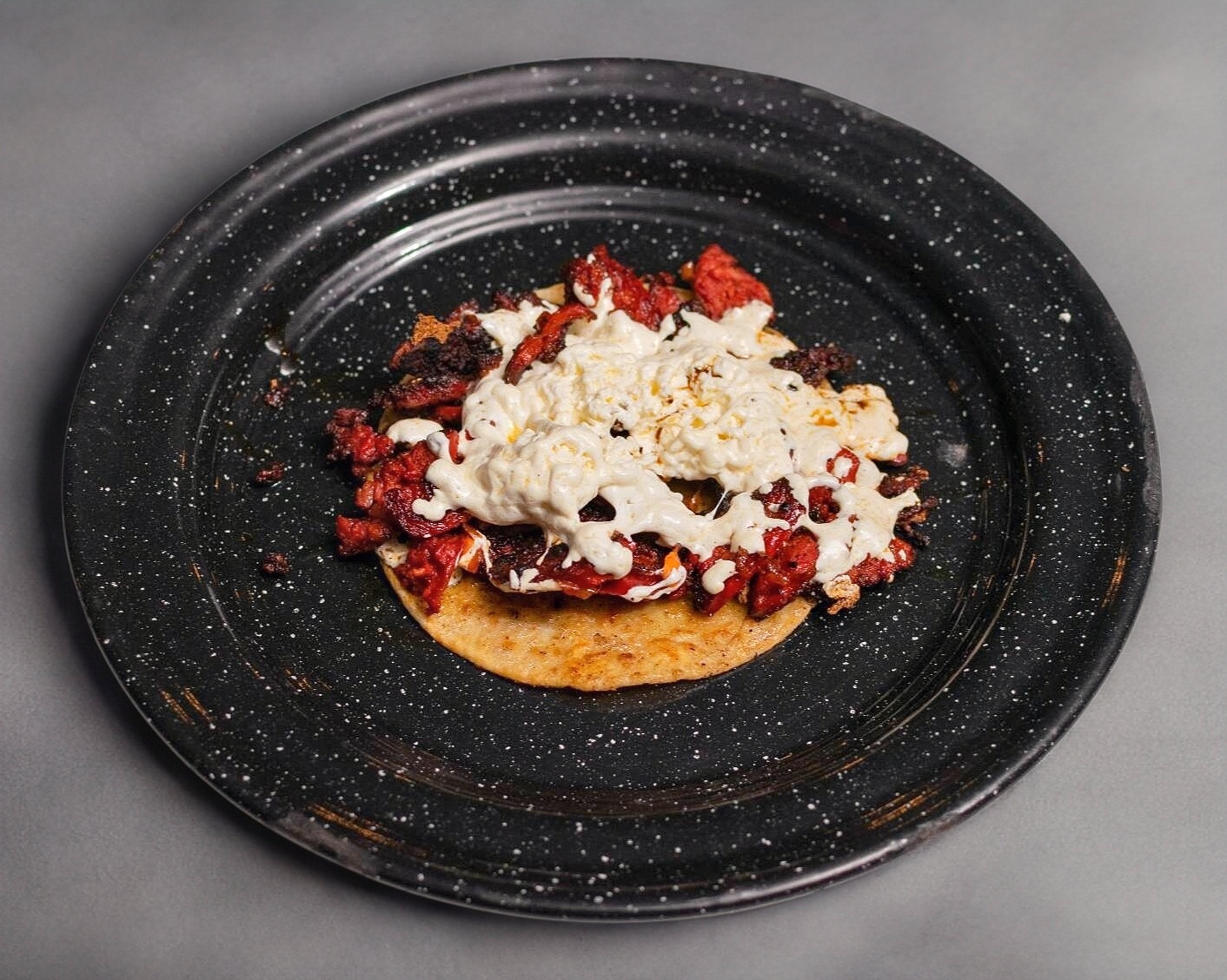 Tortilla de maiz con carne de pierna de cerdo marinada con chiles secos y especies finas jugosa sin conservadores ni colorantes