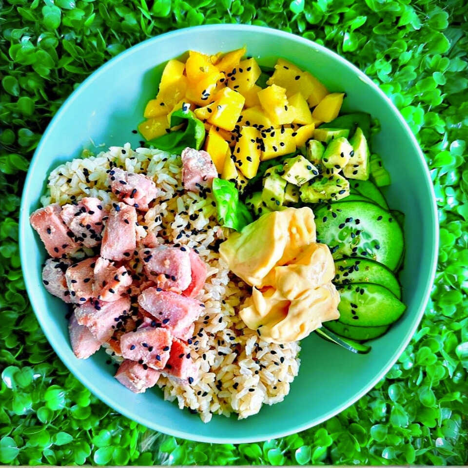 Arroz integral, pepino, espinacas, mango, aguacate, atún fresco en cubos (pídelo a tu gusto), acompañado de un aderezo especial picosito.