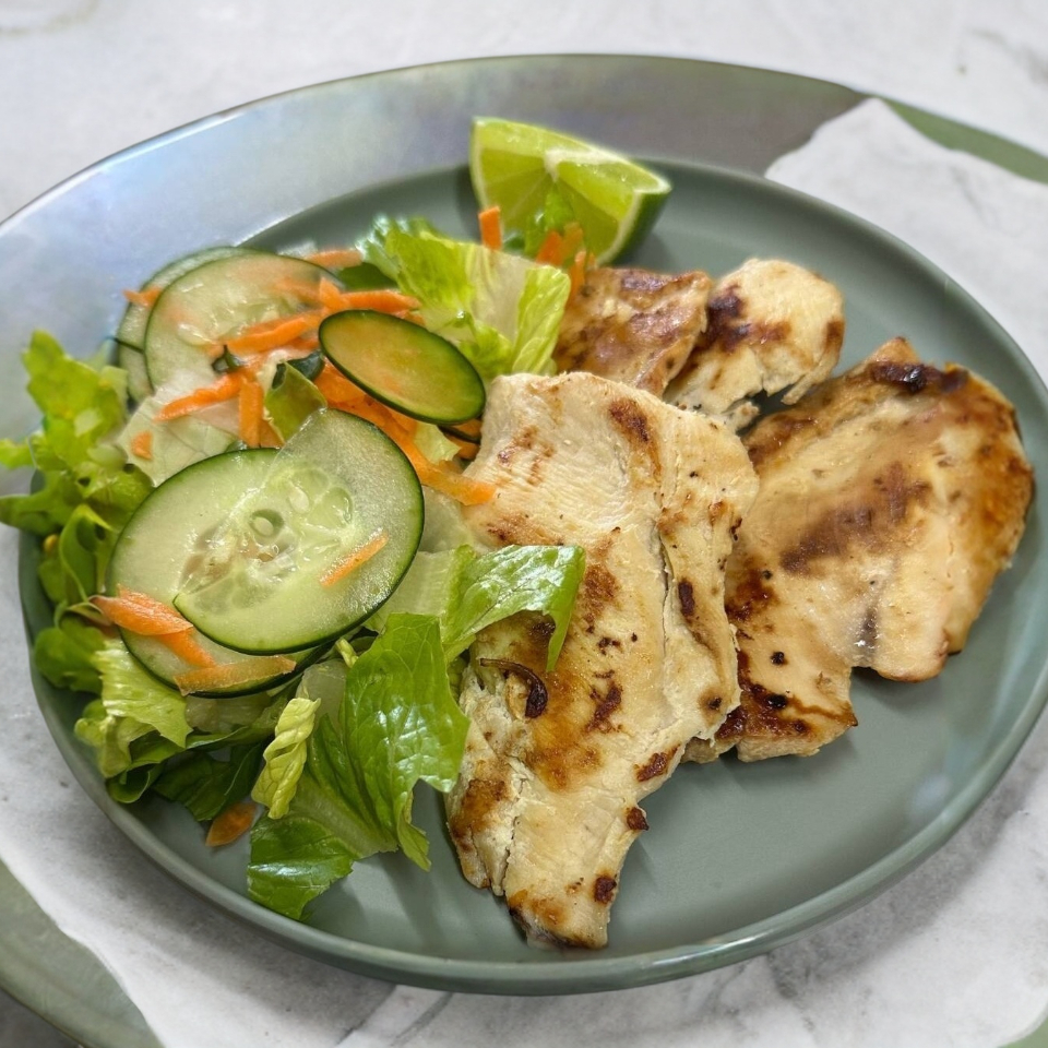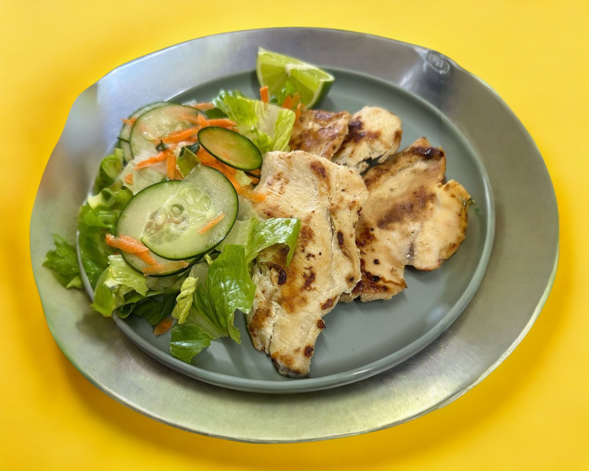 Lechuga, espinacas, tomate cherry, pepino, queso panela, pechuga de pollo, aceitunas negras, croutones, acompañada de aderezo de yogurt