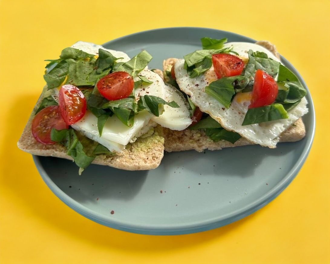Huevos estrellado sobre, pan integral con aguacate, tomate cherry y queso parmesano.