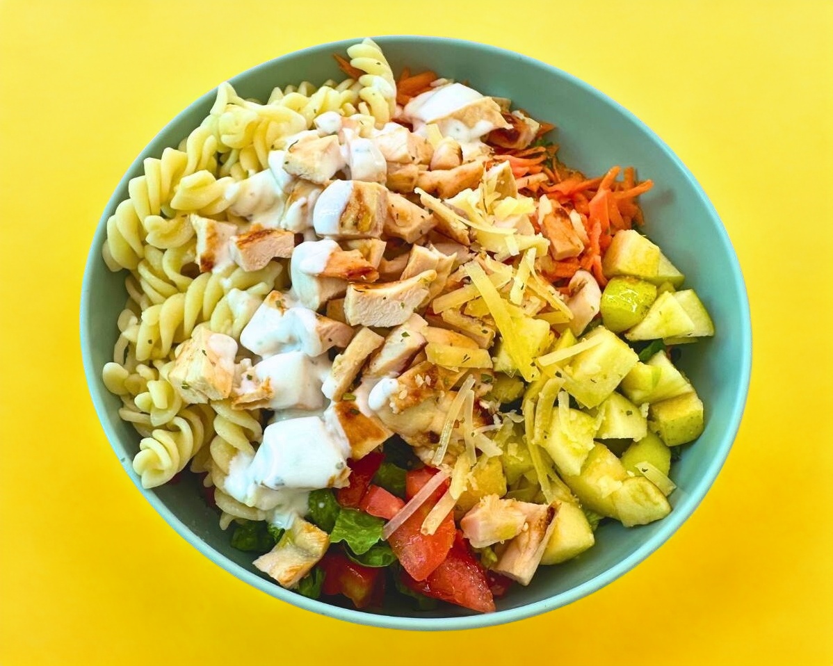 Lechuga, zanahoria, jitomate, manzana, queso parmesano, pechuga de pollo, pasta, acompañada de aderezo de yogurt