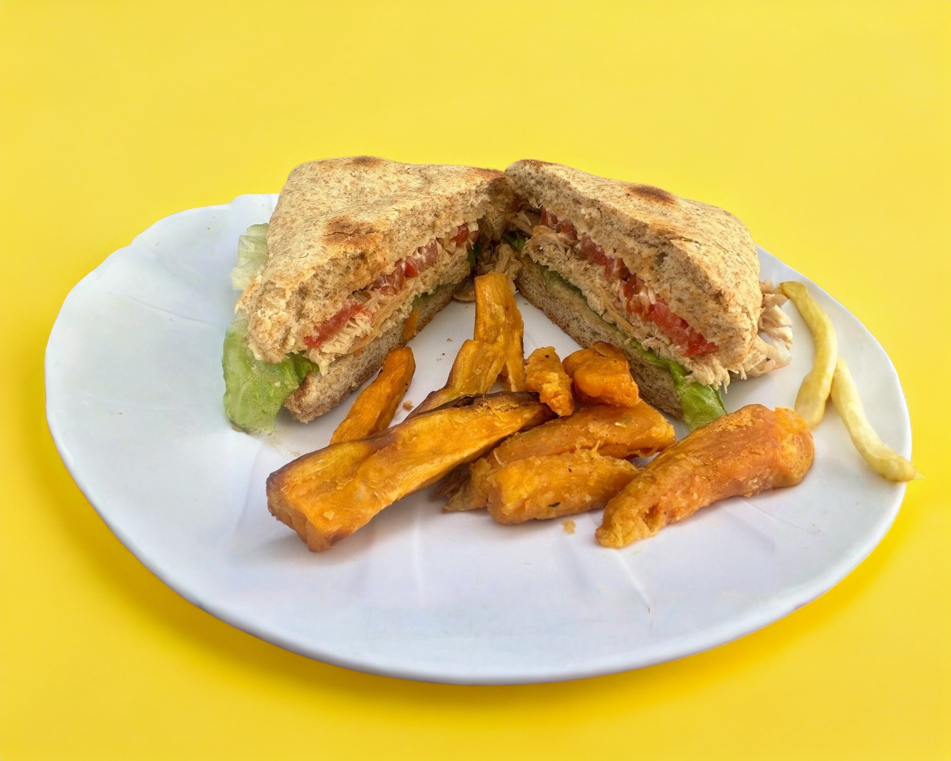 Pan integral elaborado artesanalmente relleno de pollo con aguacate, lechuga y aderezo green goddess, acompañado de yuca, platanitos o camote “frito” en air fryer.
