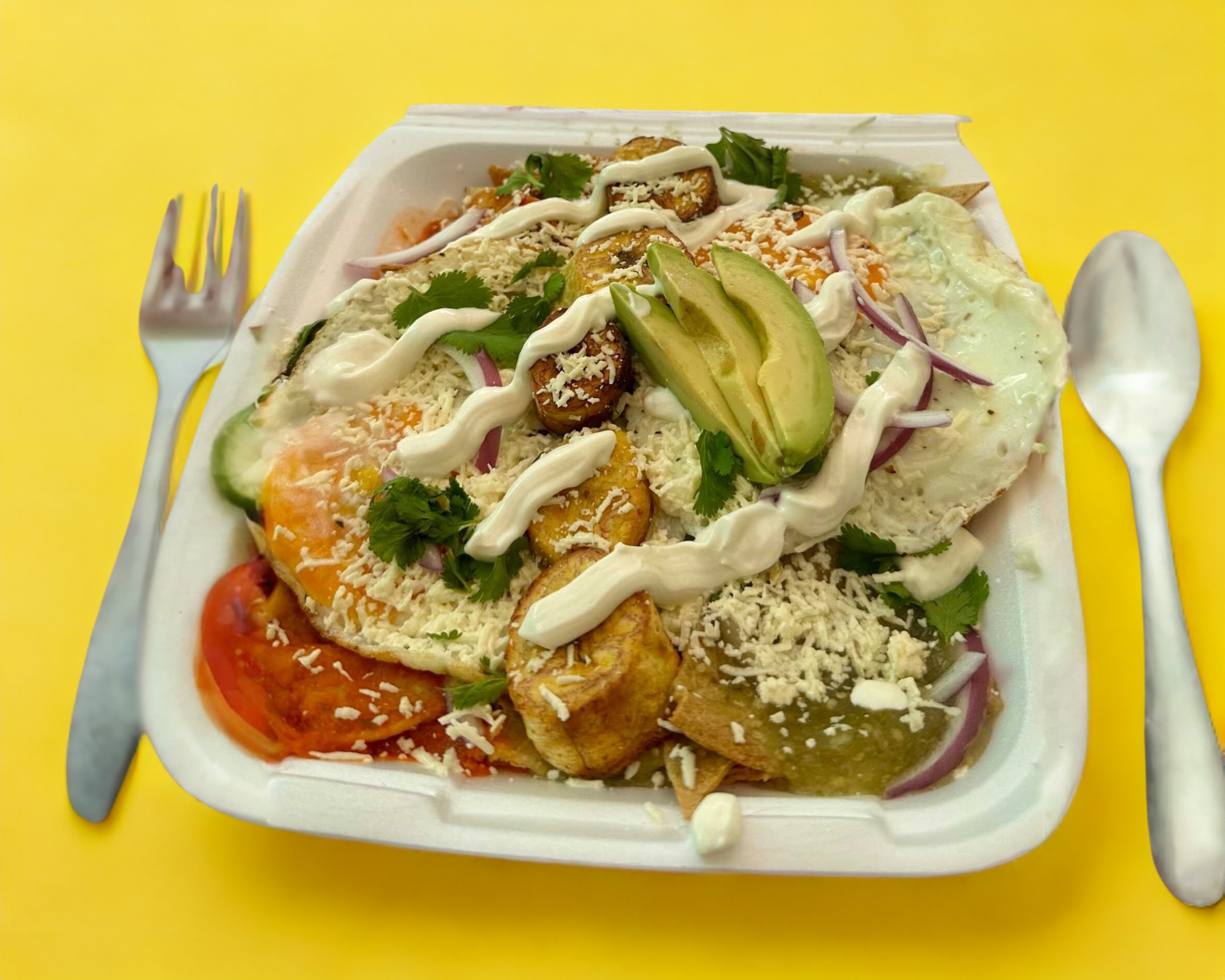 Totopos horneados con salsa de tomate roja o verde o combinadas (divorciados), crema, queso fresco, aguacate y platanitos “fritos” en air fryer.