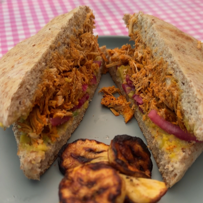 Pan integral elaborado artesanalmente relleno de pollo estilo pibil, guacamole y cebolla morada curtida, acompañado de yuca, platanitos o camote “frito” en air fryer.
